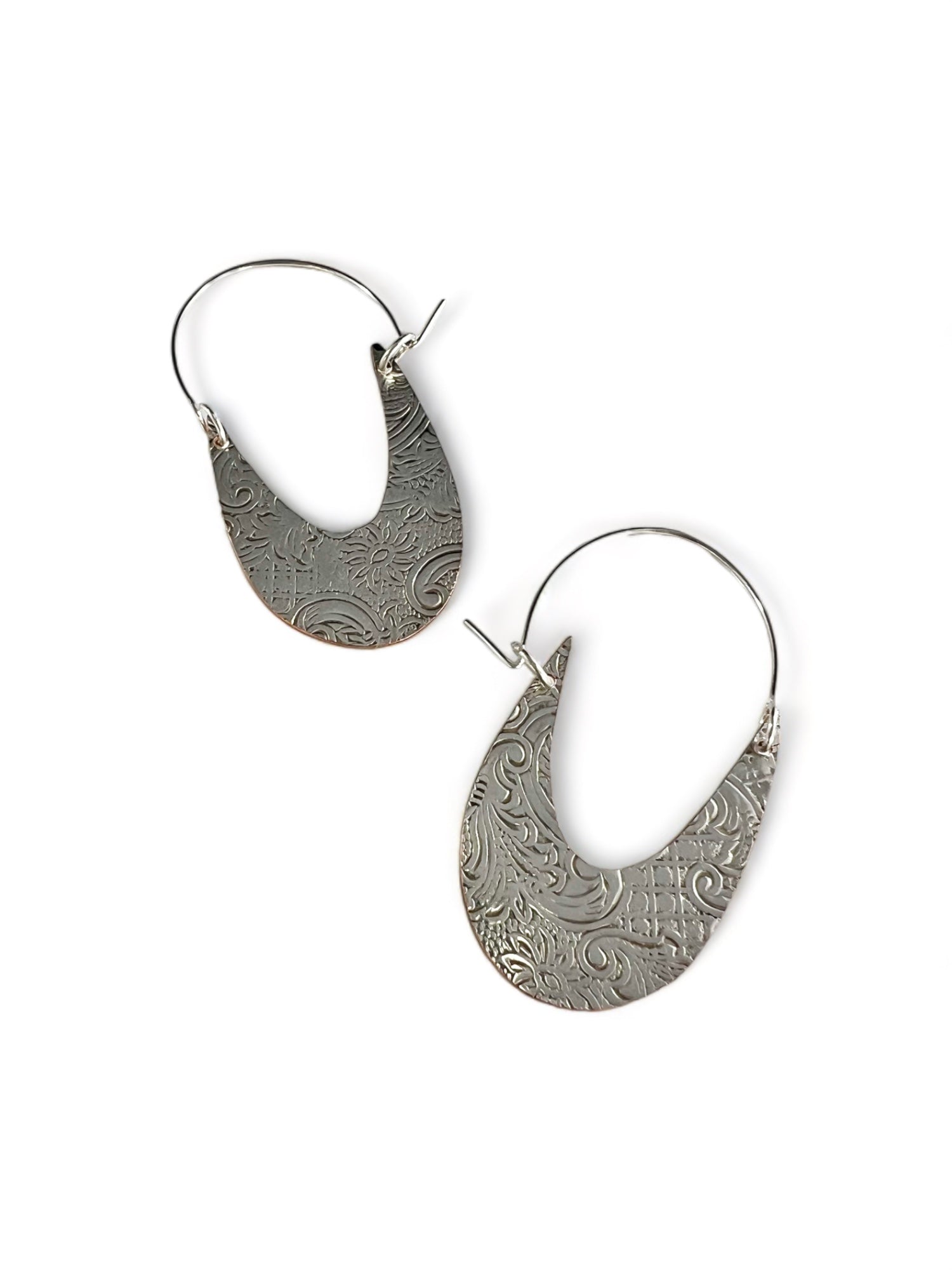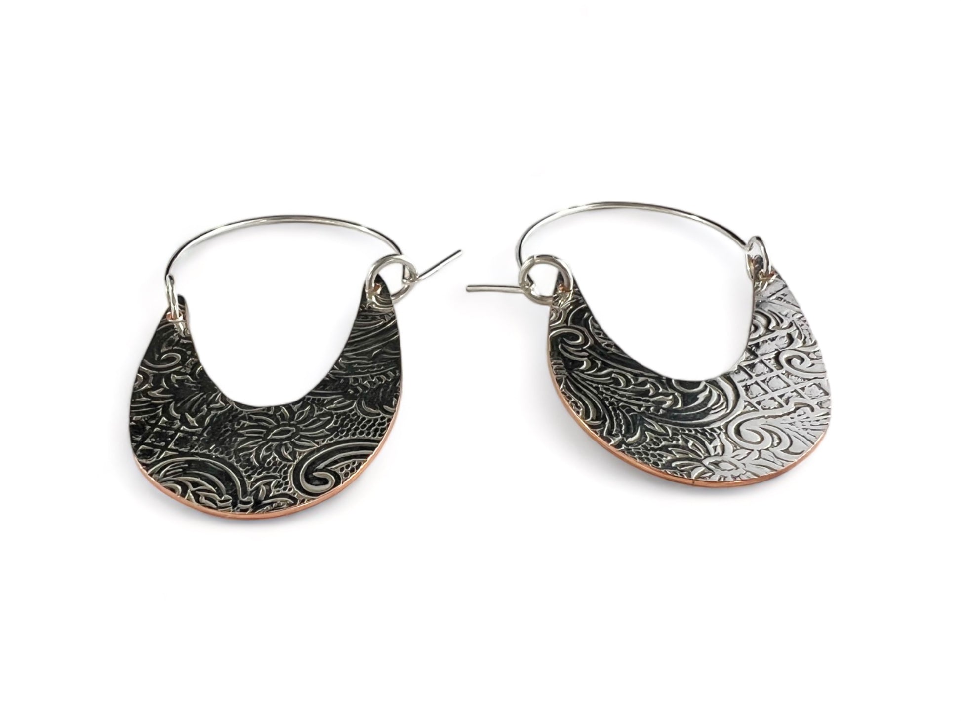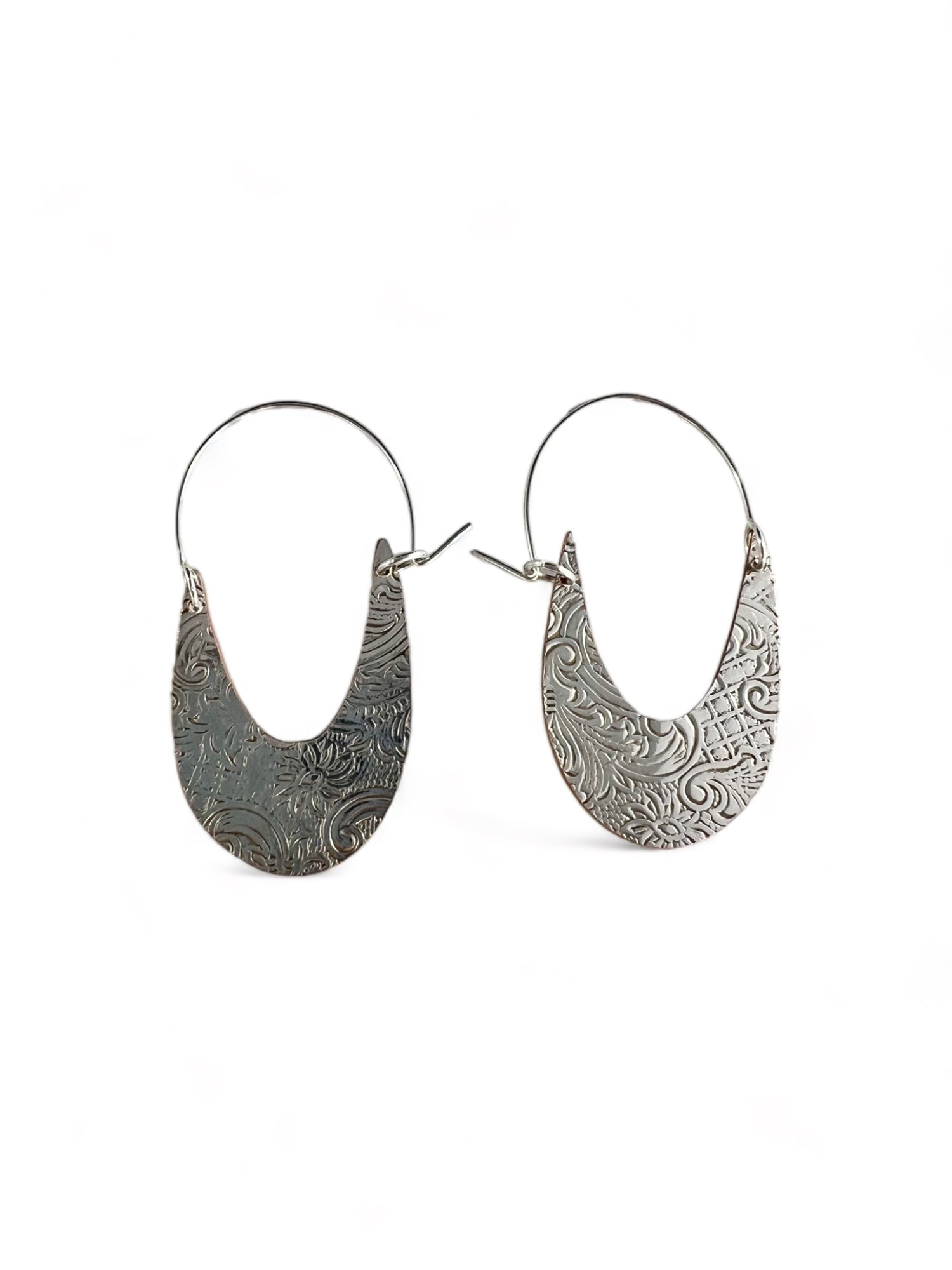 These earrings are made from a vintage silver dish which had a beautiful embossed around the edge of flowers and leaves in an art nouveau style. I followed the line of the pattern into a half moon shape, drilled it and attached a sterling silver ear wire which is connected to either side of the charm. One side is hooked and unloops from the other side for you to insert the ear wire, and then clip it back up.