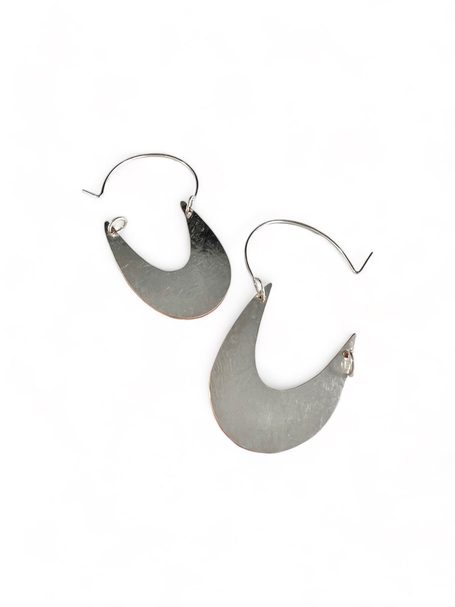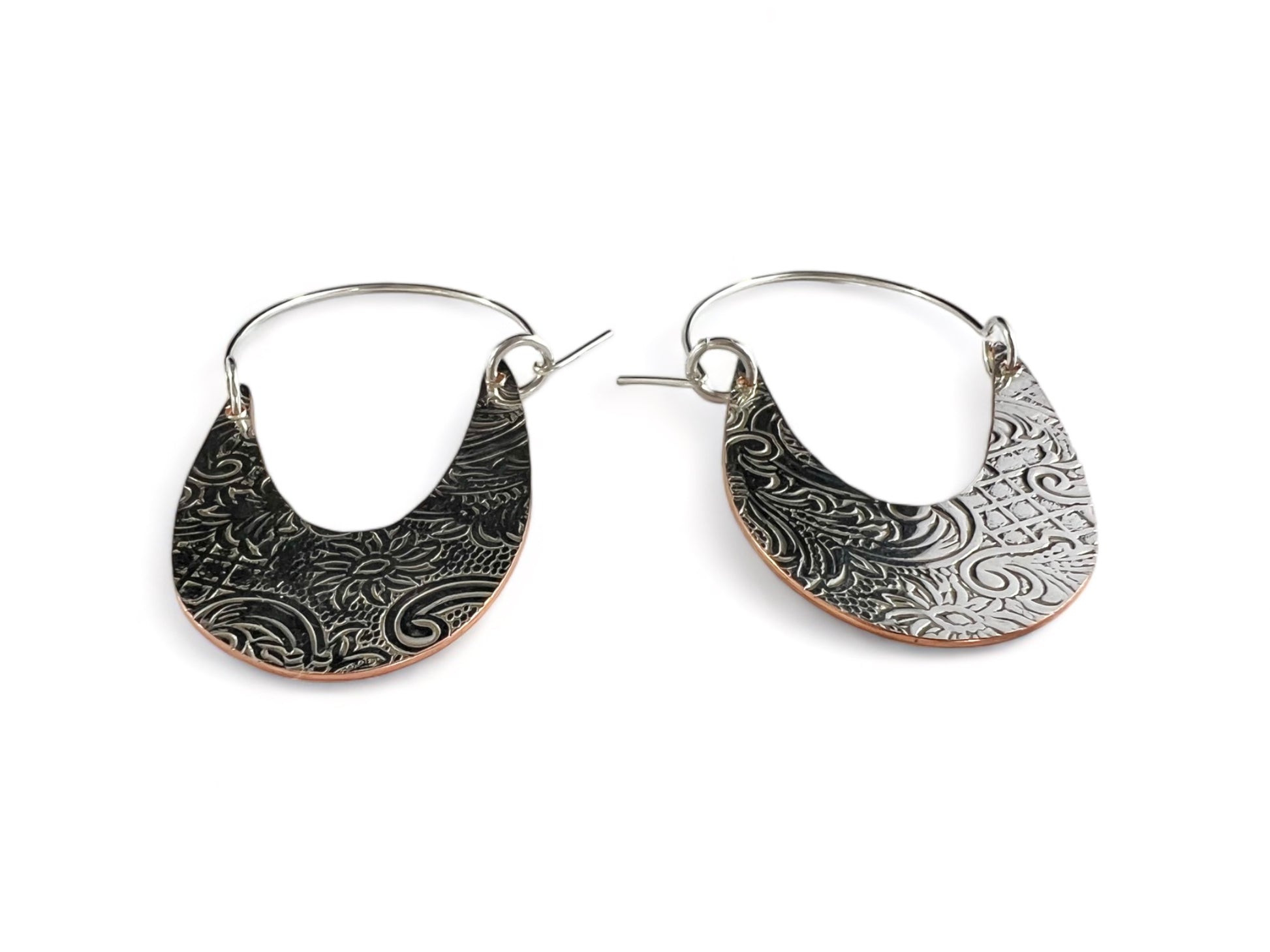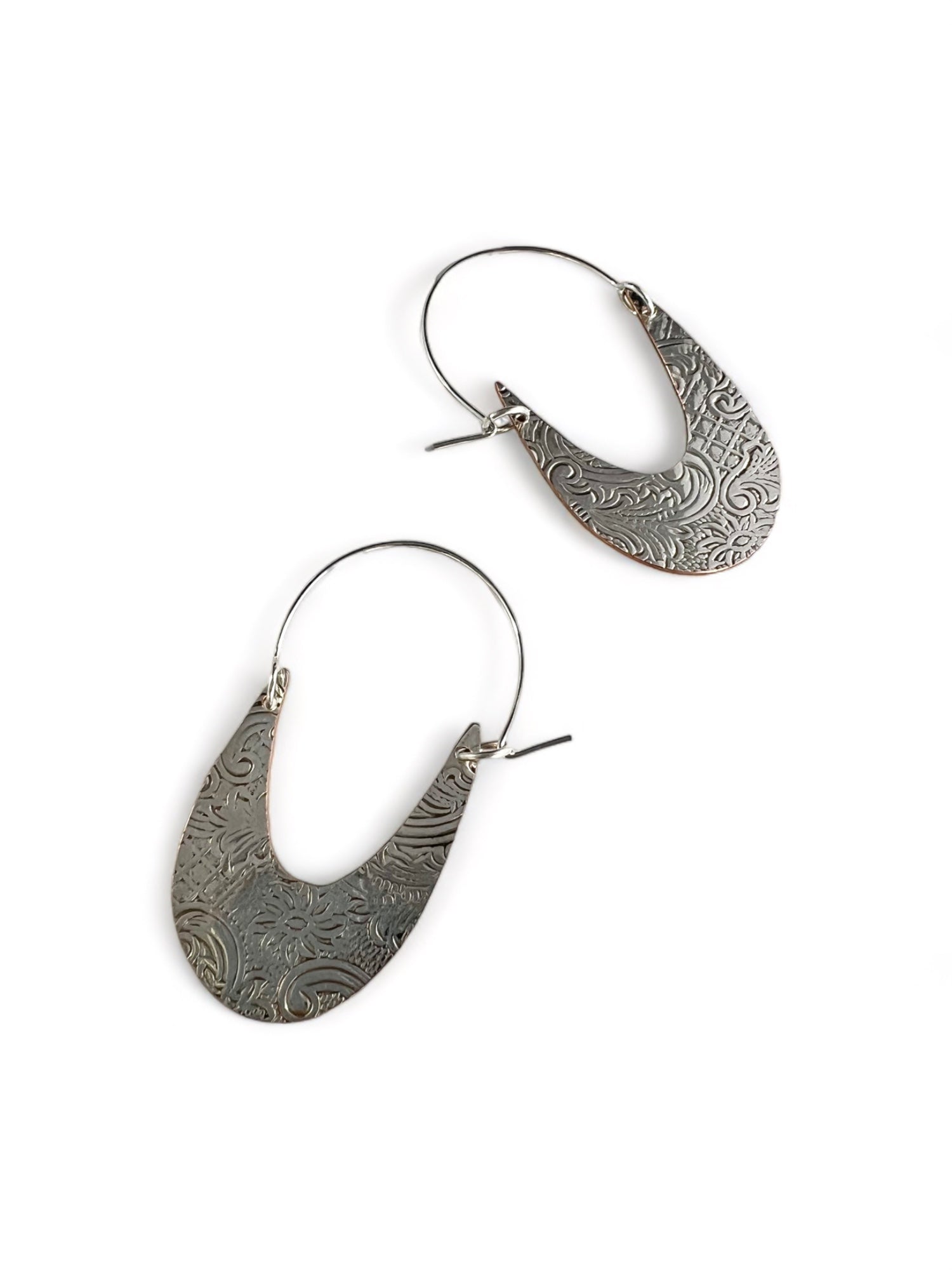 These earrings are made from a vintage silver dish which had a beautiful embossed around the edge of flowers and leaves in an art nouveau style. I followed the line of the pattern into a half moon shape, drilled it and attached a sterling silver ear wire which is connected to either side of the charm. One side is hooked and unloops from the other side for you to insert the ear wire, and then clip it back up.