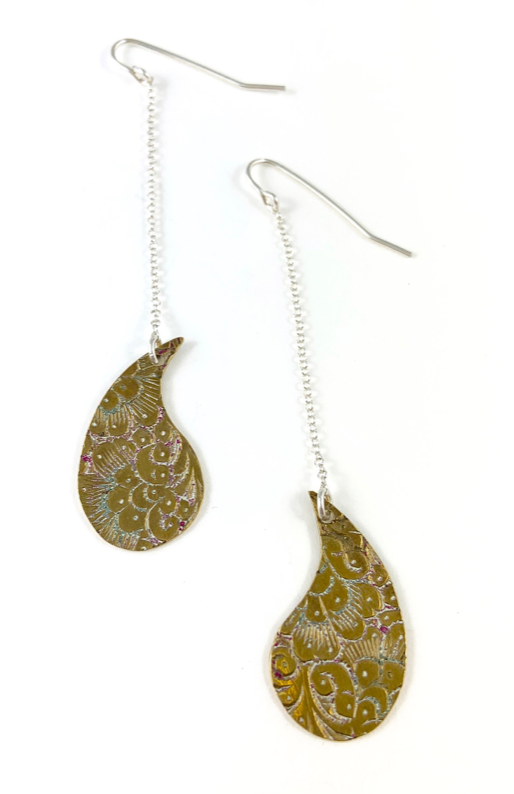 These sweet earrings are made from a vintage brass plate from India which is intricately carved with beautiful designs. I hand cut the teardrop shape out, filed and sanded it down to a perfect finish and it hangs off sterling silver chain.