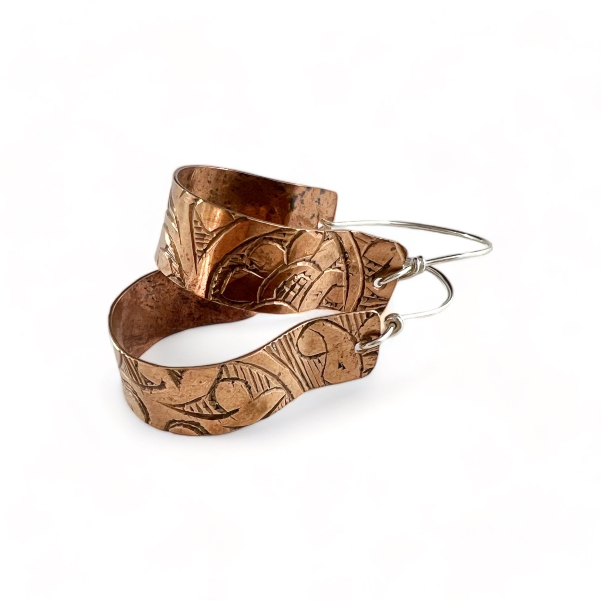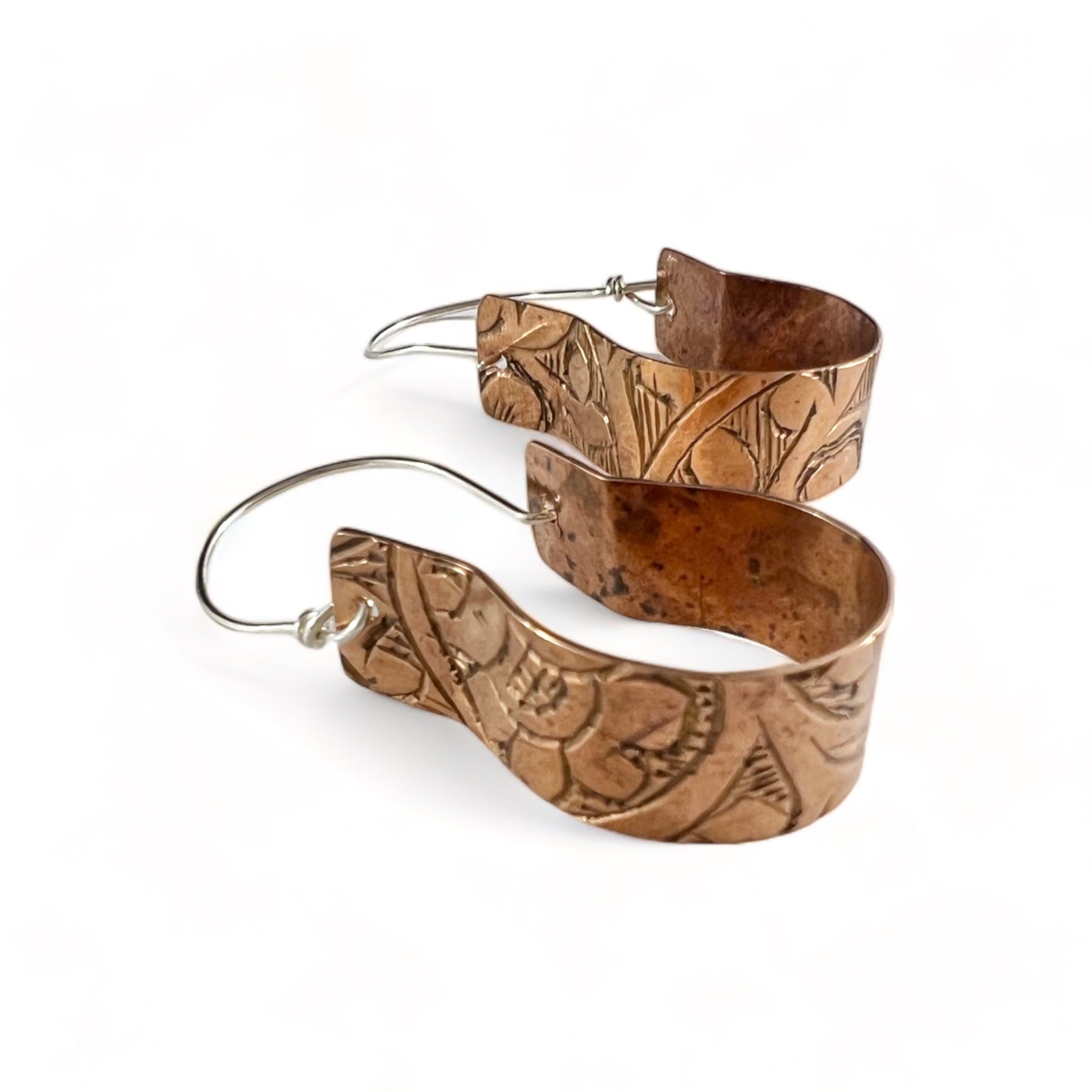 These earrings are made from a vintage copper dish which had a beautiful embossed design of flowers and leaves in art nouveau designs decorating it.