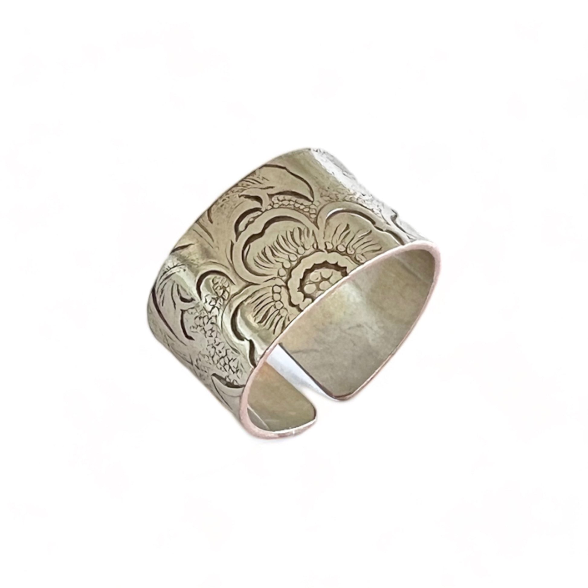 This lovely ring is made from an ornately decorated vintage silver serving platter, out of which I hand cut the ring, filed and sanded it down to a perfect finish and hammered it around a ring mandrel to make this one of a kind adjustable wrap ring.