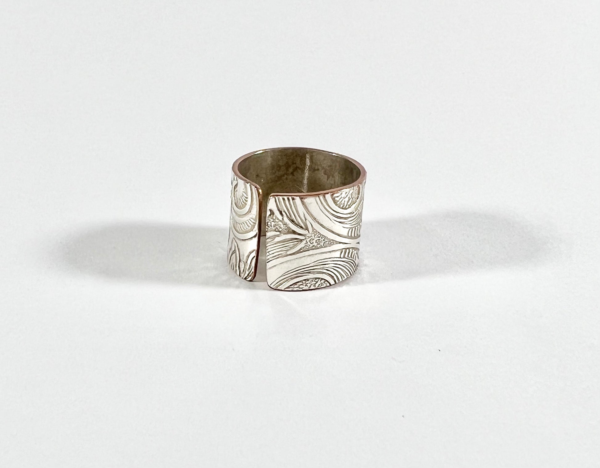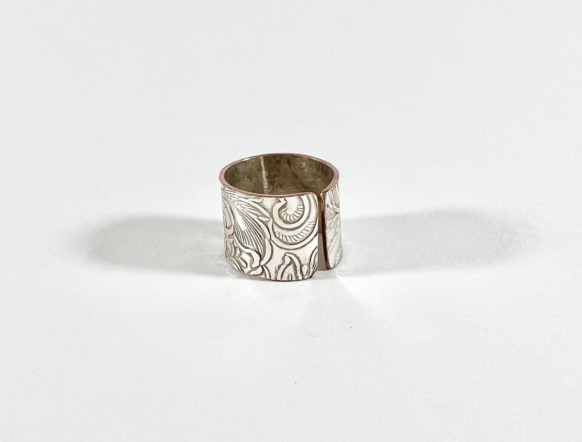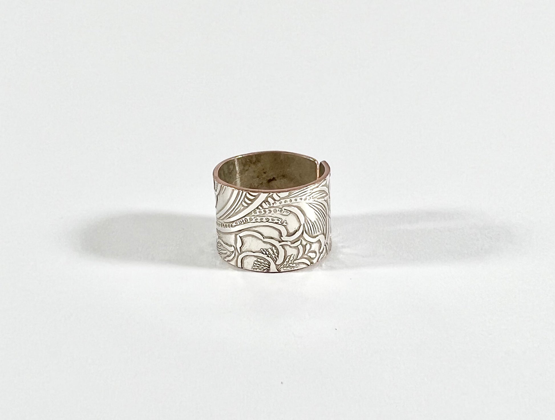 This lovely ring is made from an ornately decorated vintage silver serving platter, out of which I hand cut the ring, filed and sanded it down to a perfect finish and hammered it around a ring mandrel to make this one of a kind adjustable wrap ring.
