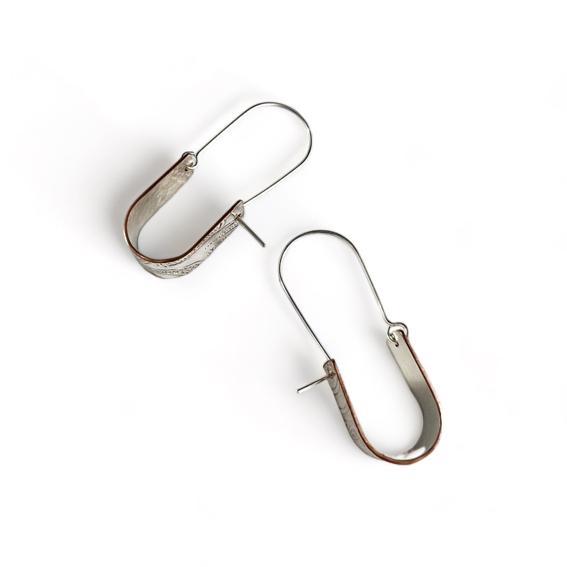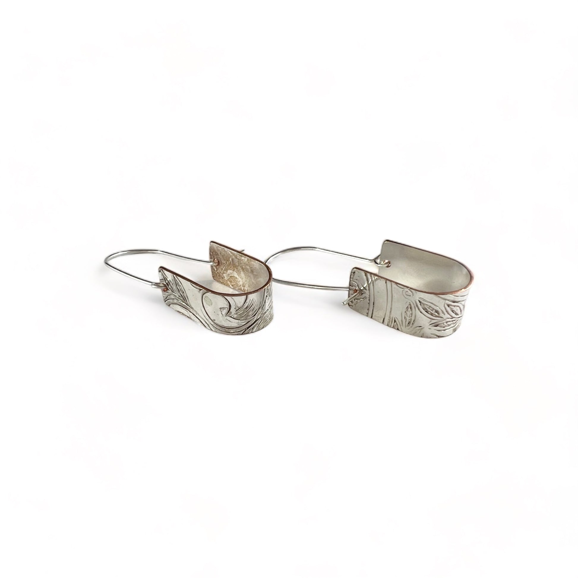I used the plate to create these earrings by cutting out bands, then hammering and drilling and attaching a sterling silver ear wire.