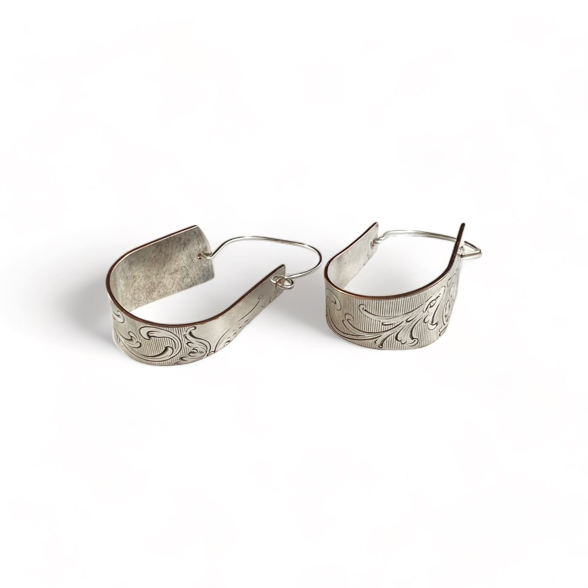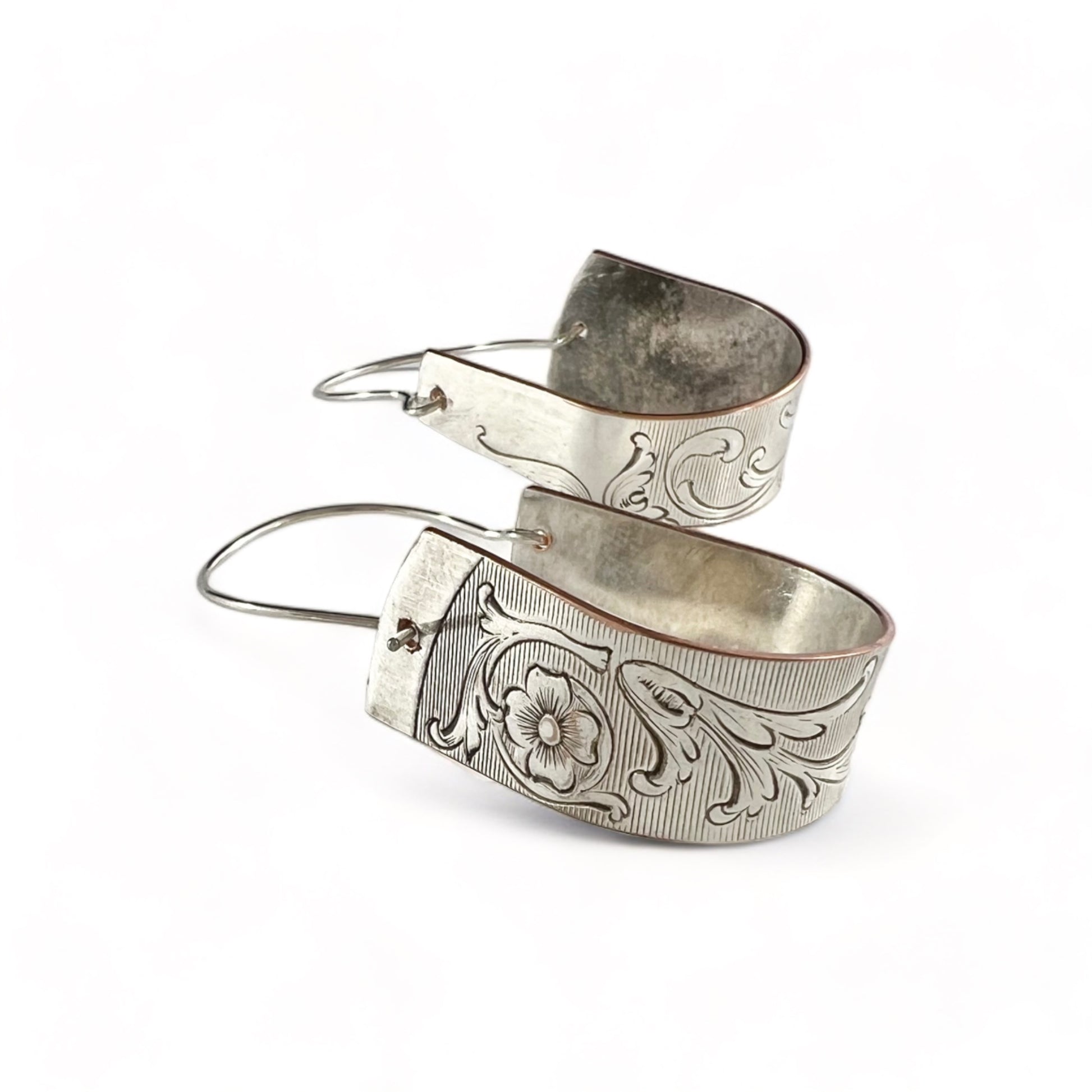 These earrings are made from a vintage silver plated brass dish which had a beautiful engraved design of flowers and leaves in art nouveau designs decorating it.
