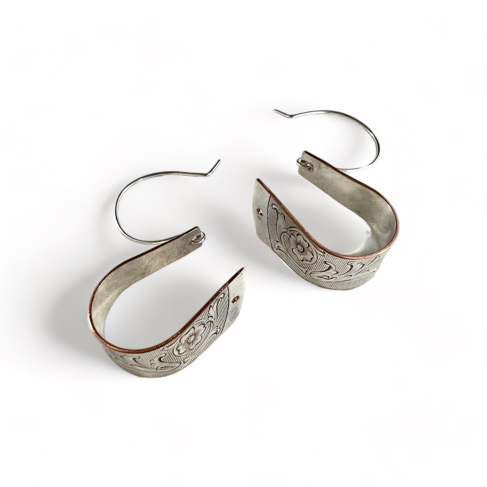I used the plate to create these earrings by cutting out bands, then hammering and drilling and attaching a sterling silver ear wire.
