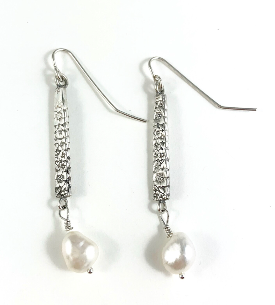 These earrings are made from the middle section of two vintage silver plated spoon handles. The original spoons were decorated with many little flowers. I have soldered a sterling silver loop on the top which attaches to a sterling silver hook, and at the base is an organically shaped silver fresh water pearl.
