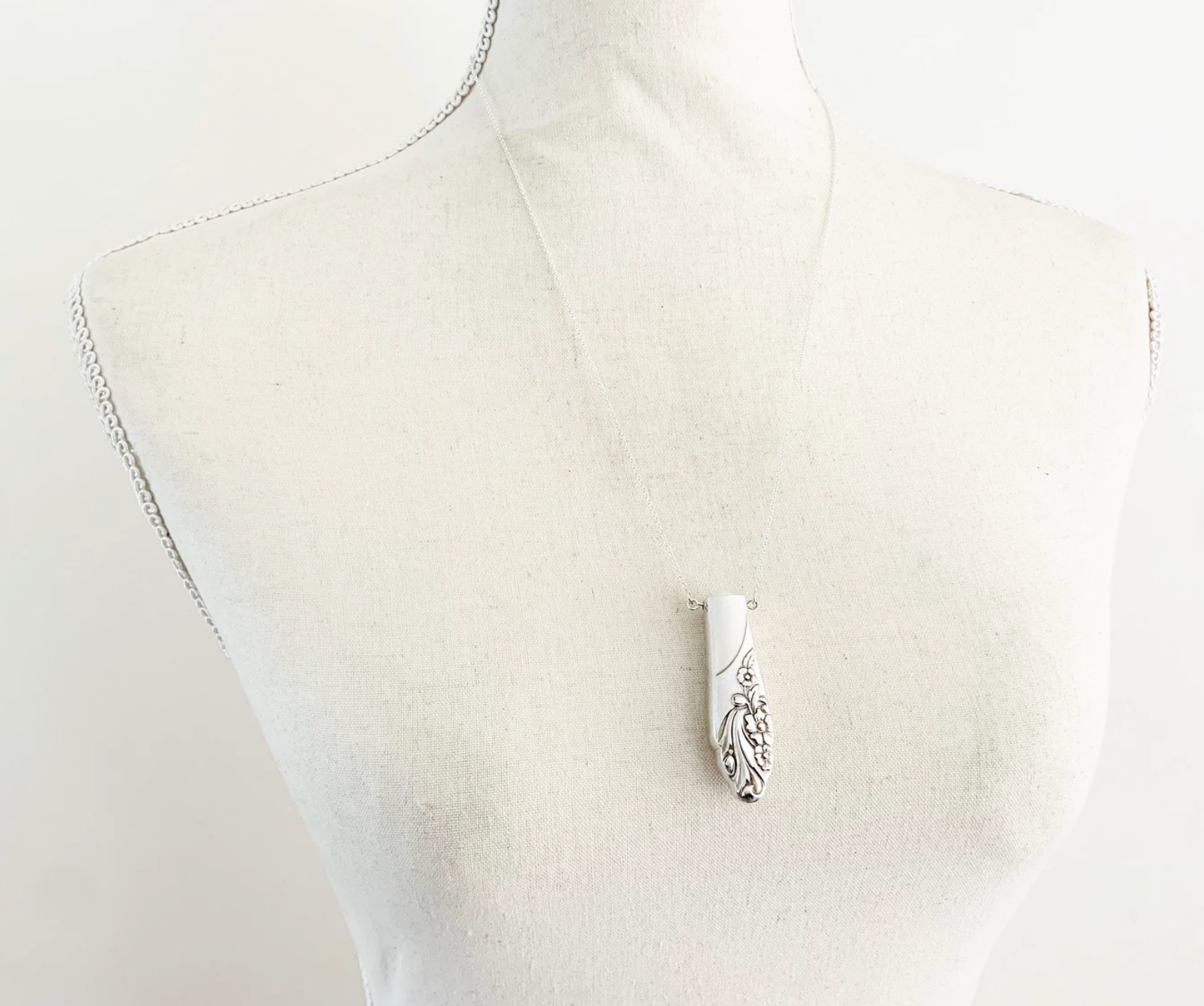 This necklace is made from the end of a vintage knife, which I have hand cut away from the rest of the knife, filed and sanded to a perfect finish before drilling through the top. I have then fastened a cream fresh water pearl bead into the lip of the pendant and the whole pendant hangs off a sterling silver chain.