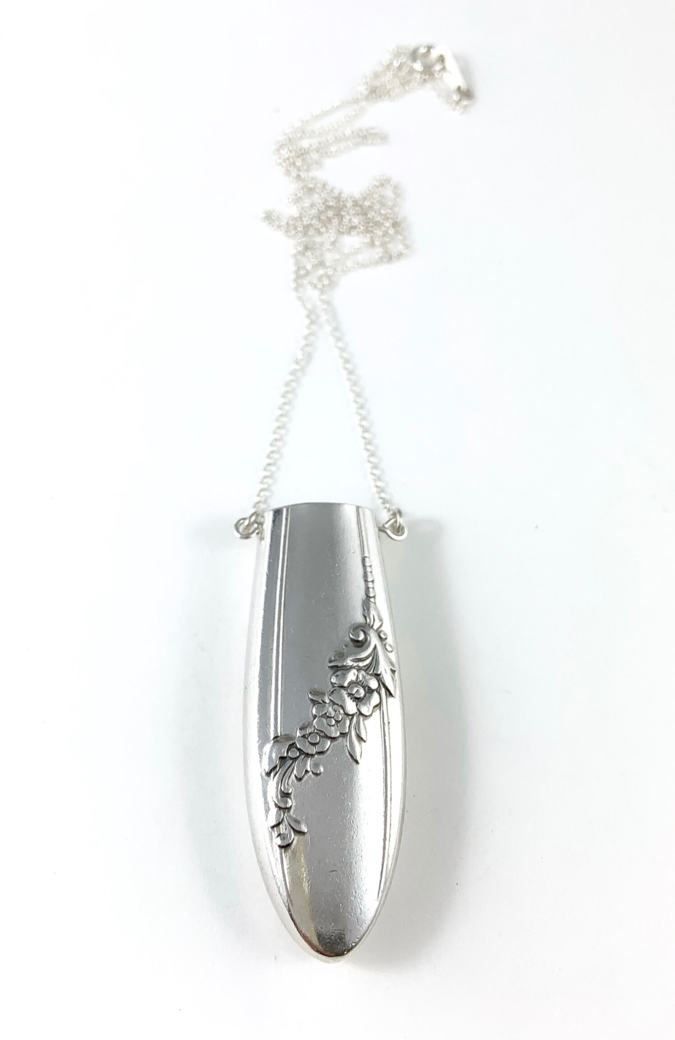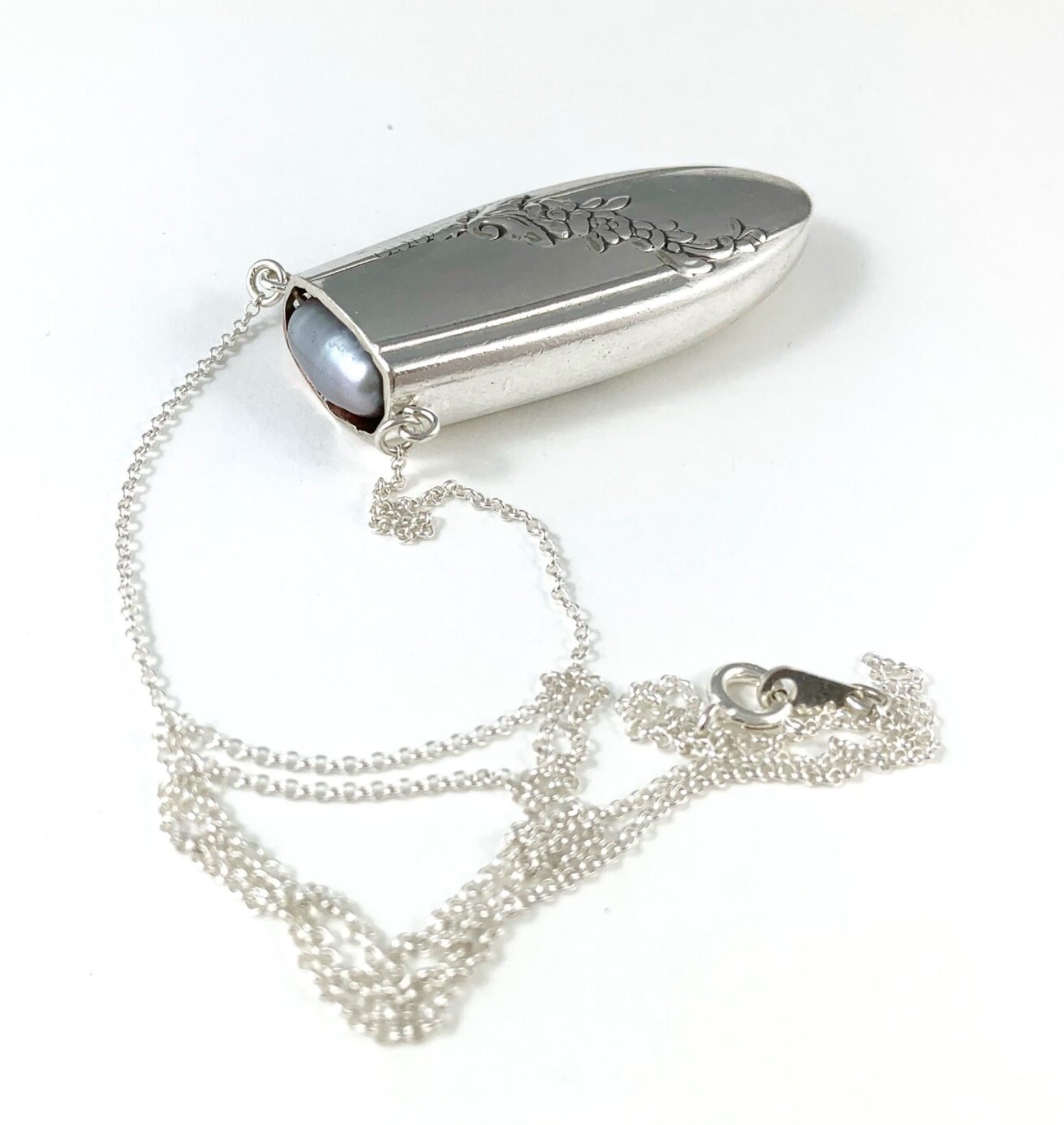 This necklace is made from the end of a vintage knife, which I have hand cut away from the rest of the knife, filed and sanded to a perfect finish before drilling through the top. I have then fastened a silver fresh water pearl bead into the lip of the pendant and the whole pendant hangs off a sterling silver chain.