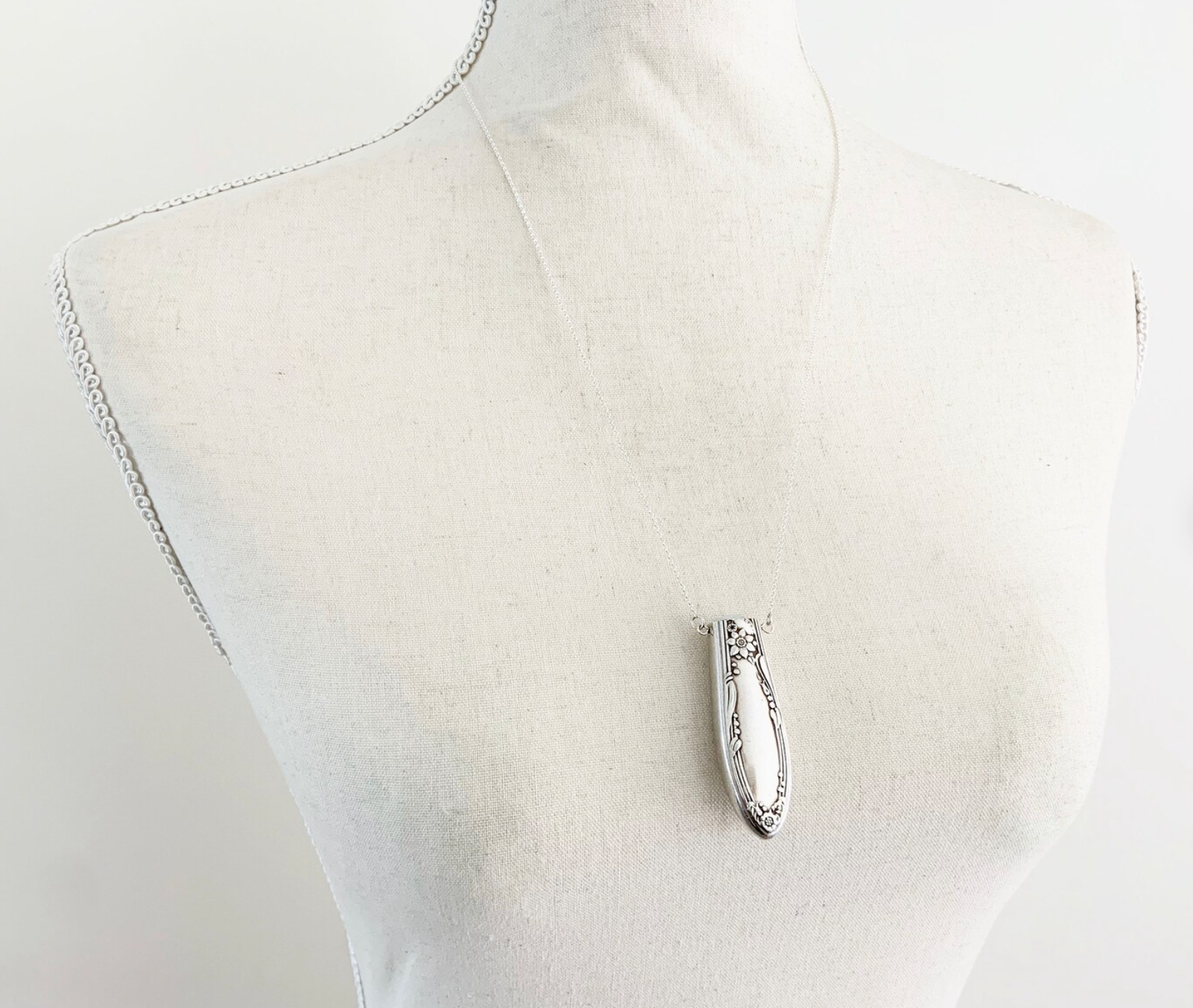 This necklace is made from the end of a vintage knife, which I have hand cut away from the rest of the knife, filed and sanded to a perfect finish before drilling through the top. I have then fastened a cream fresh water pearl bead into the lip of the pendant and the whole pendant hangs off a sterling silver chain.