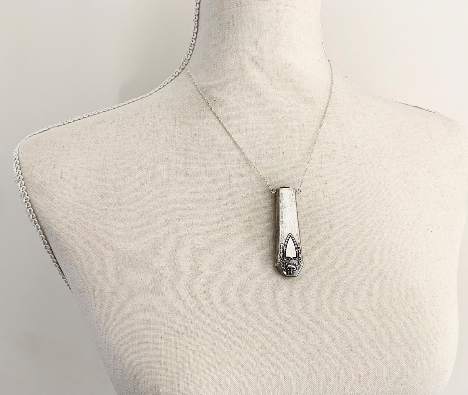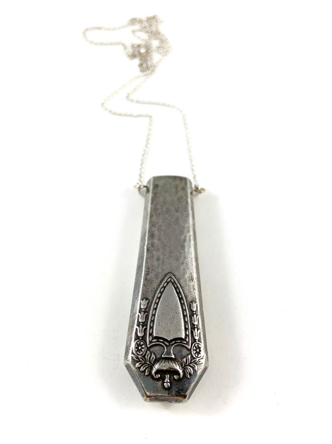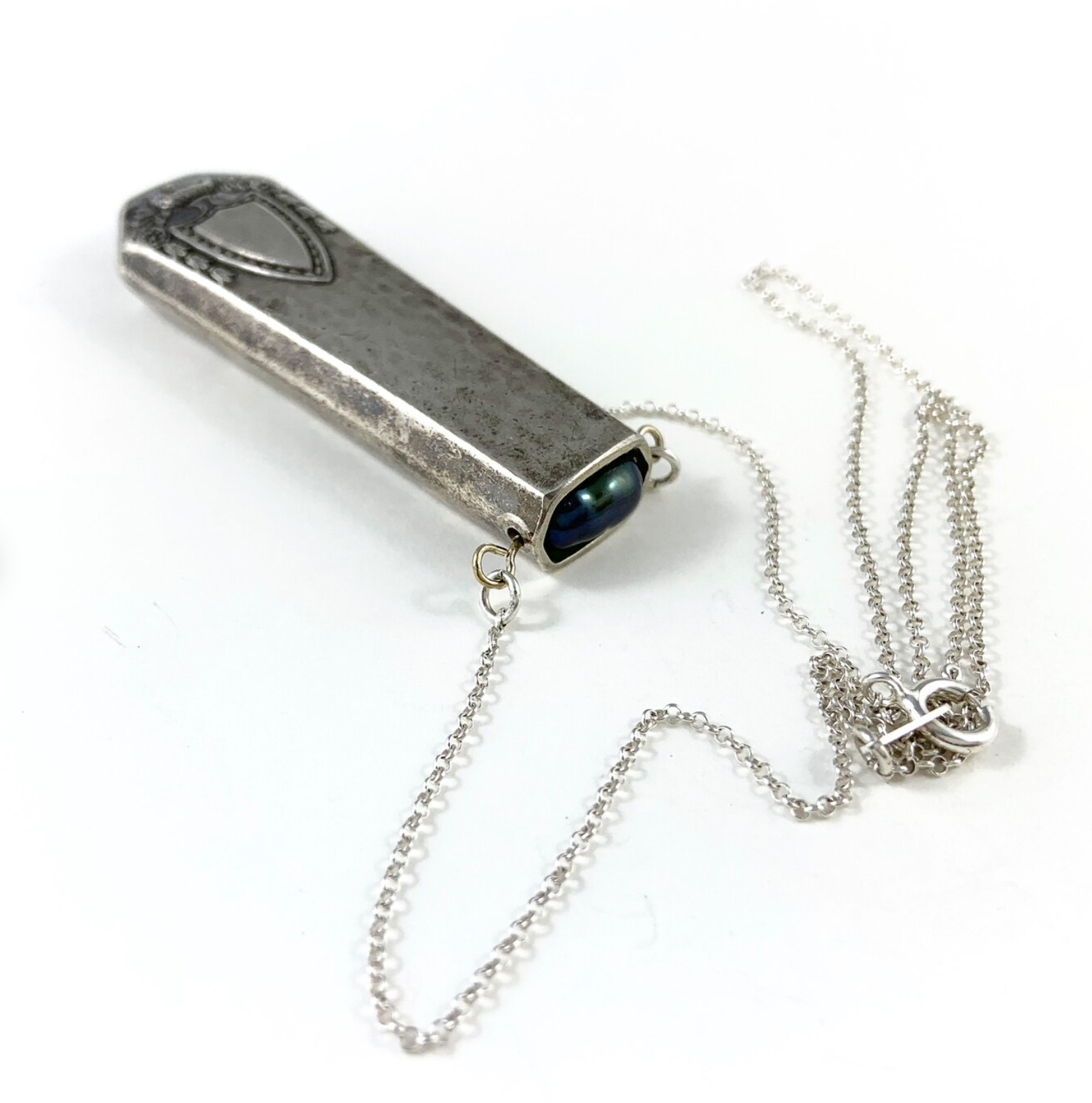 This necklace is made from the end of a vintage knife, which I have hand cut away from the rest of the knife, filed and sanded to a perfect finish before drilling through the top. I have then fastened a dark grey fresh water pearl bead into the lip of the pendant and the whole pendant hangs off a sterling silver chain.