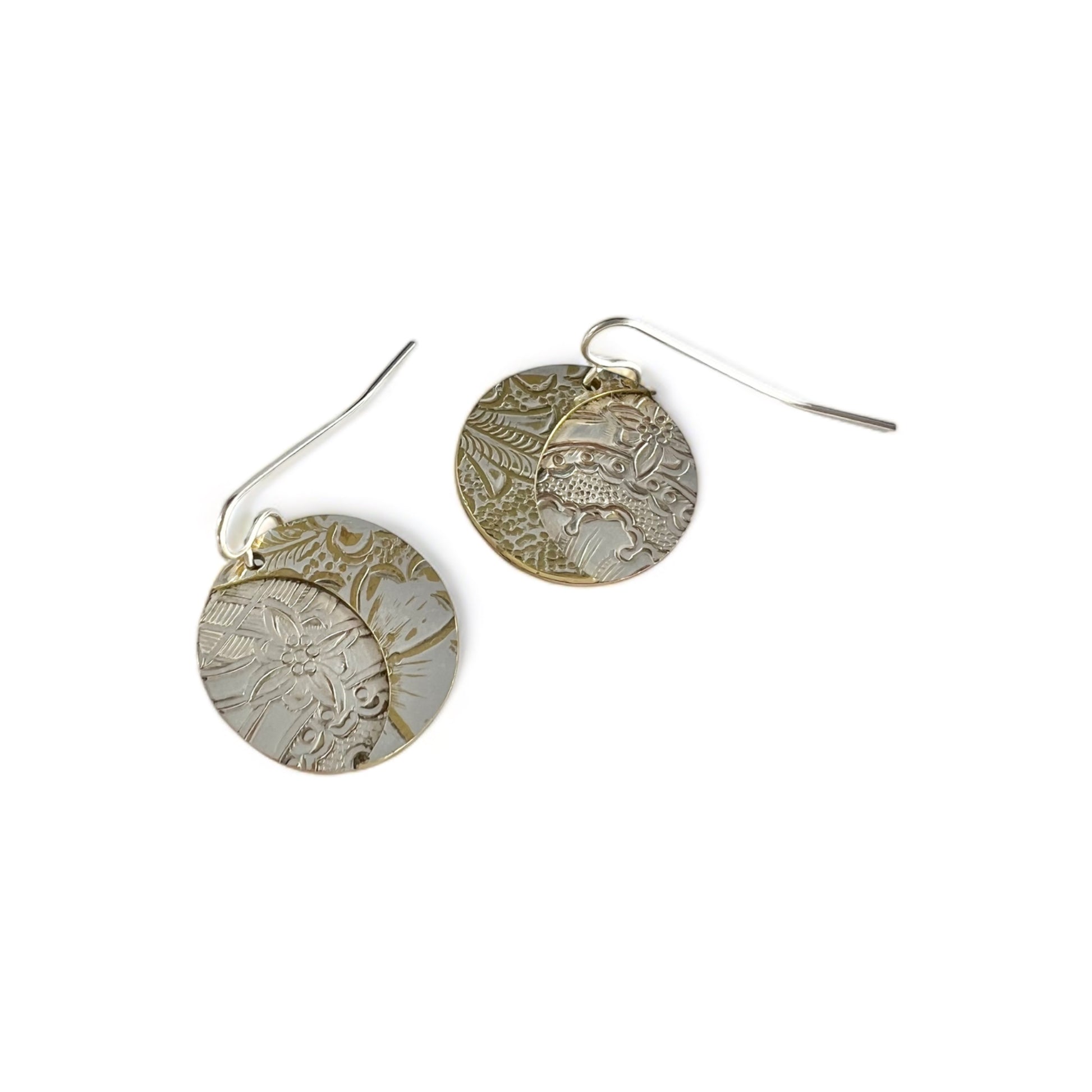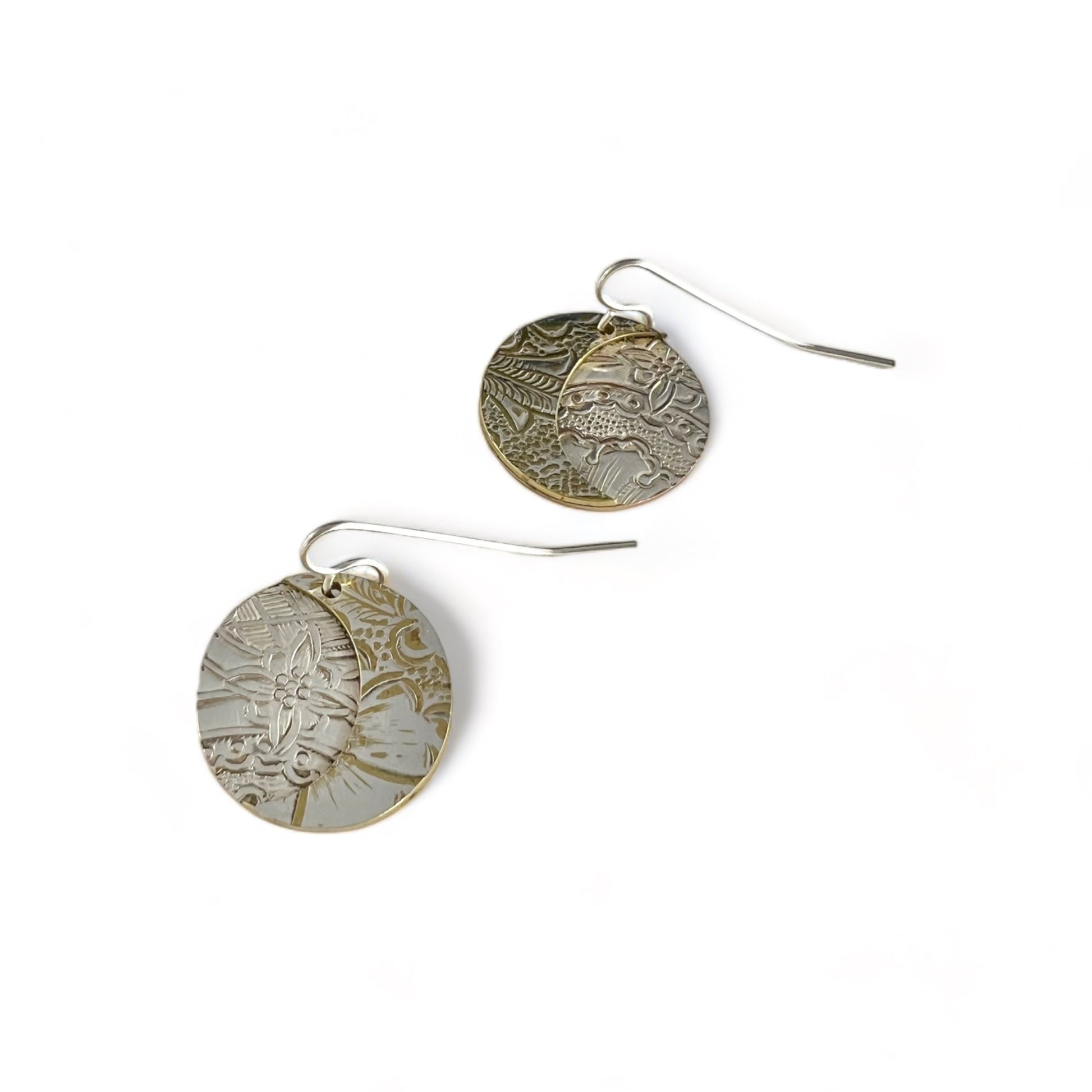 These sweet earrings are made from a vintage brass plate from India which is intricately carved with beautiful designs. I hand cut the teardrop shape out, filed and sanded it down to a perfect finish and it hangs off sterling silver chain.