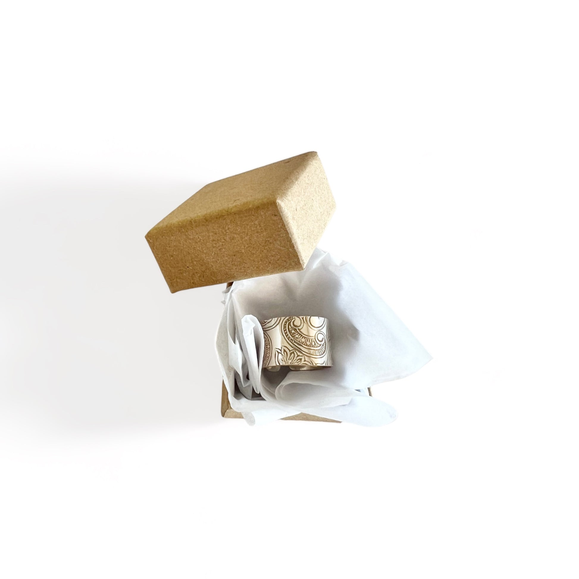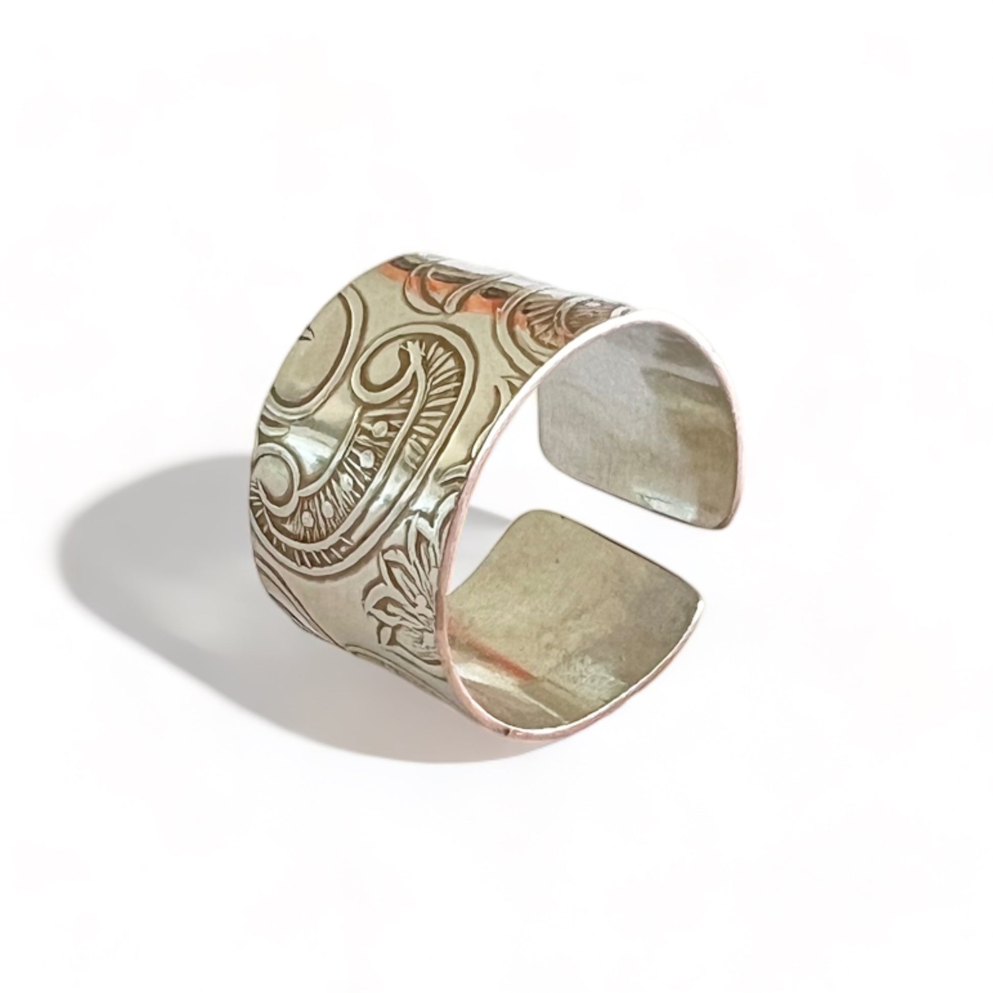 This lovely ring is made from an ornately decorated vintage silver serving platter, out of which I hand cut the ring, filed and sanded it down to a perfect finish and hammered it around a ring mandrel to make this one of a kind adjustable wrap ring.
