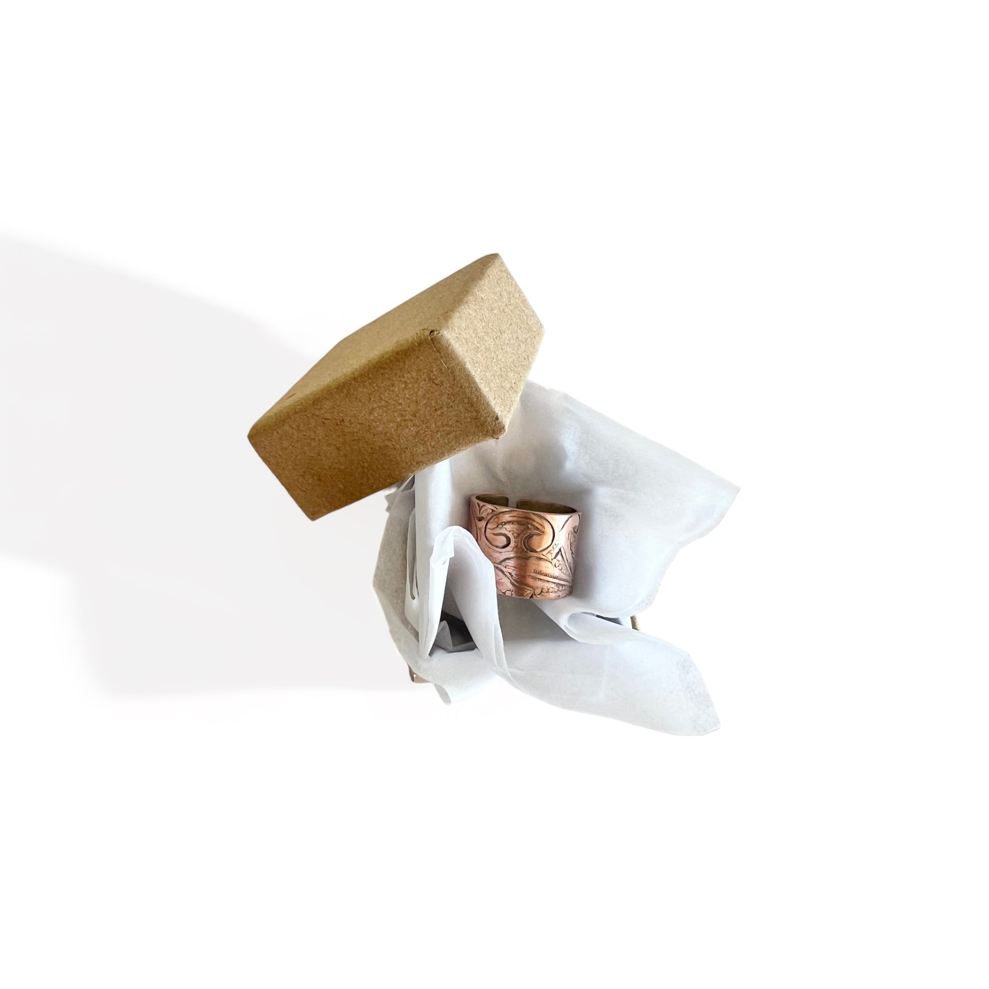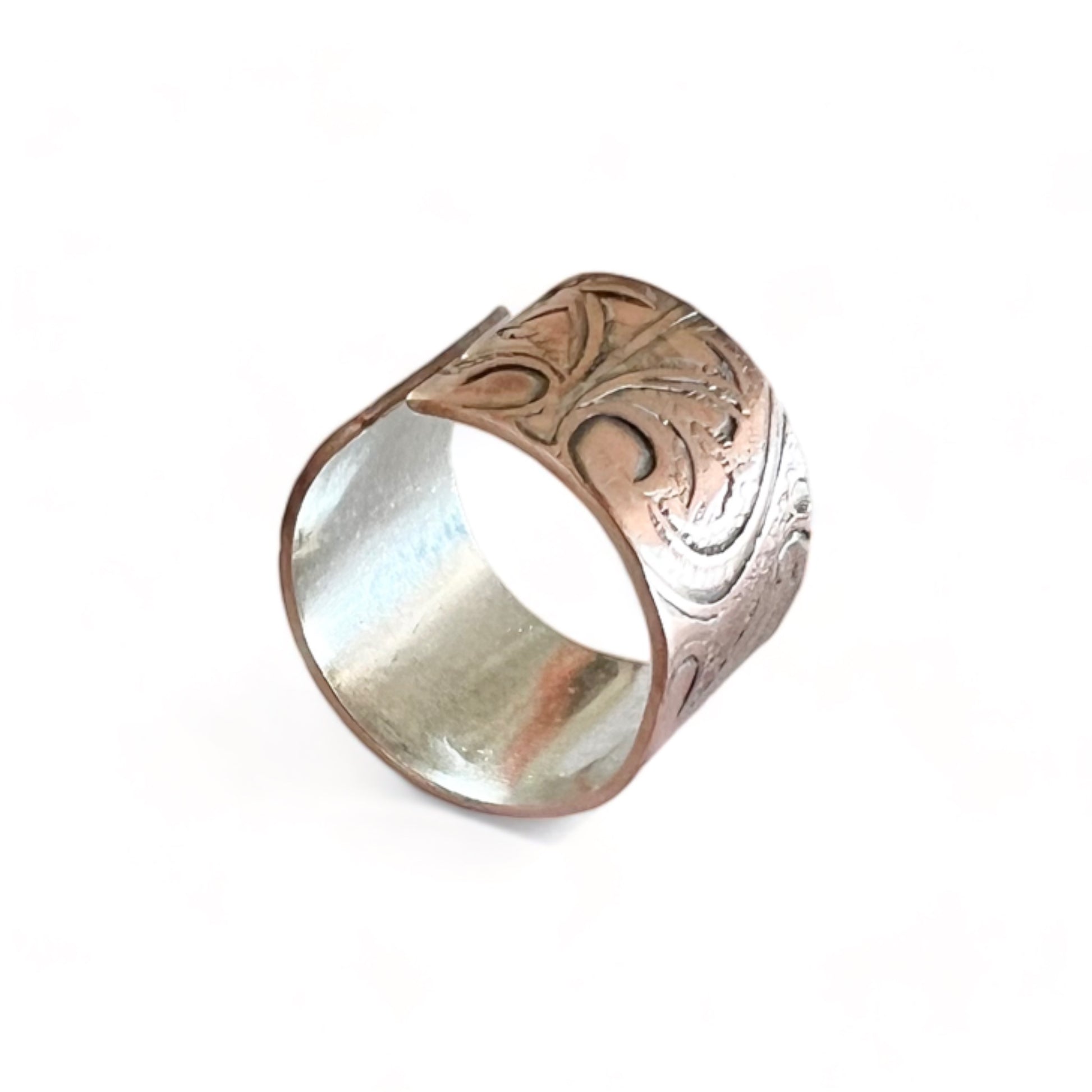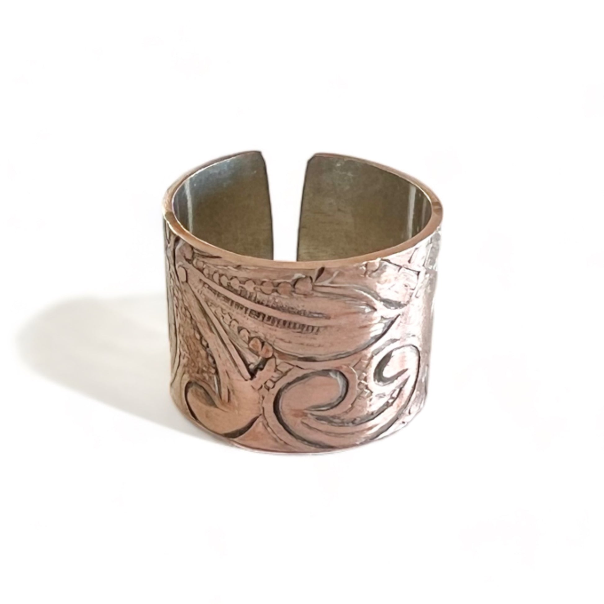 This lovely ring is made from an ornately decorated vintage silver serving platter, out of which I hand cut the ring, filed and sanded it down to a perfect finish and hammered it around a ring mandrel to make this one of a kind adjustable wrap ring.