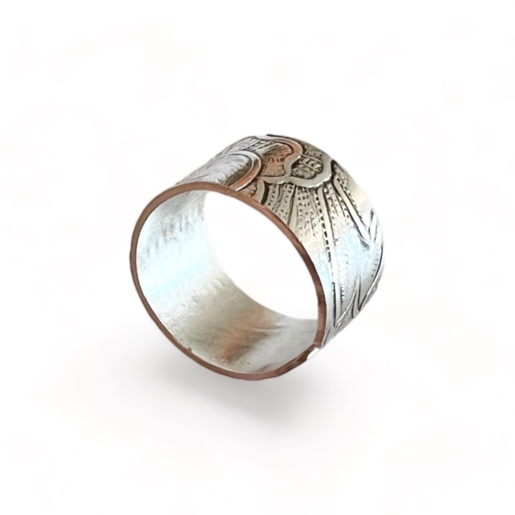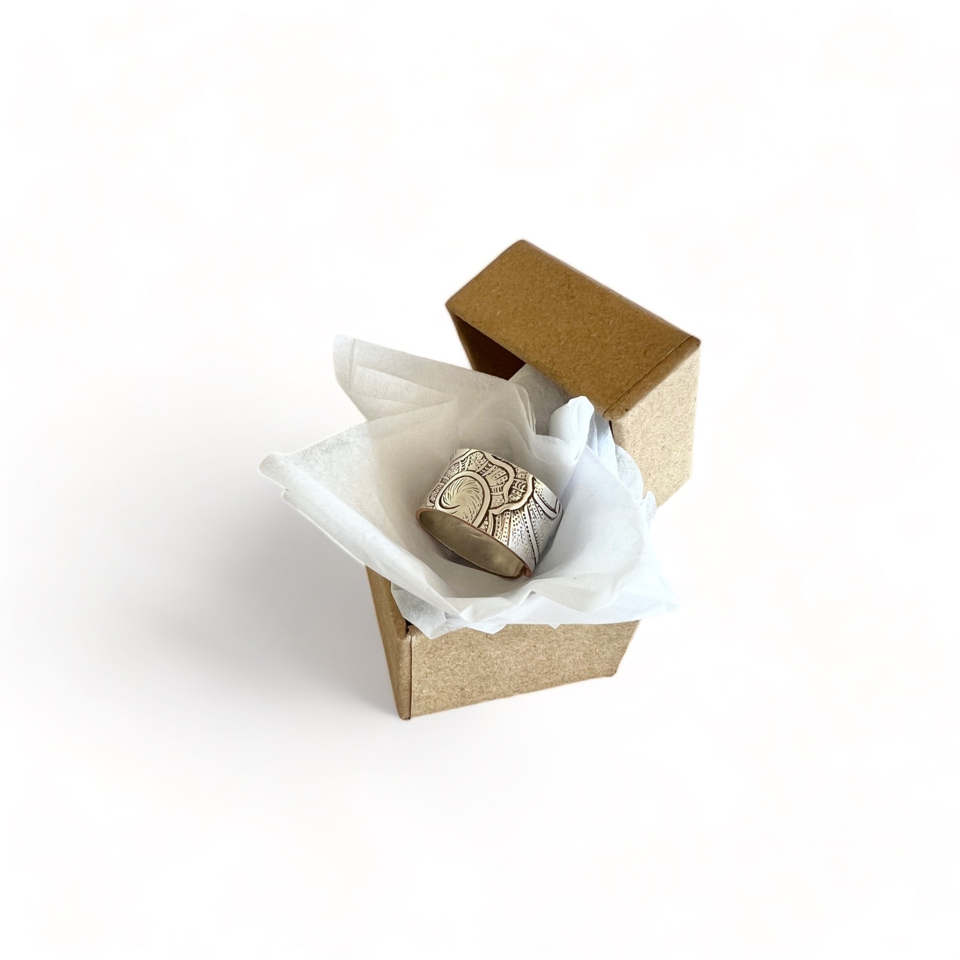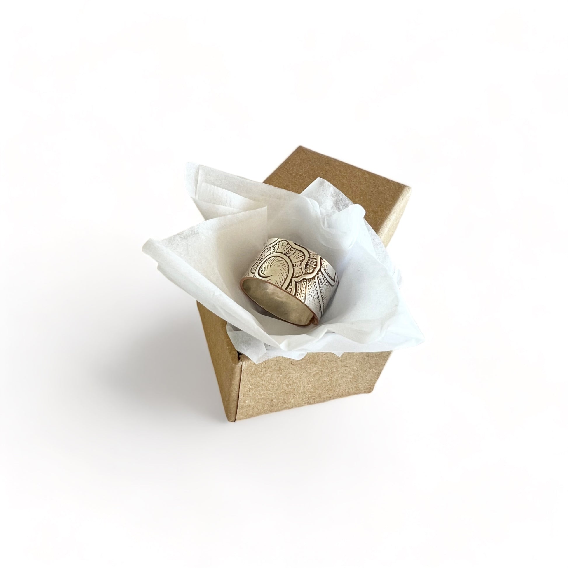 This lovely ring is made from an ornately decorated vintage silver serving platter, out of which I hand cut the ring, filed and sanded it down to a perfect finish and hammered it around a ring mandrel to make this one of a kind adjustable wrap ring.