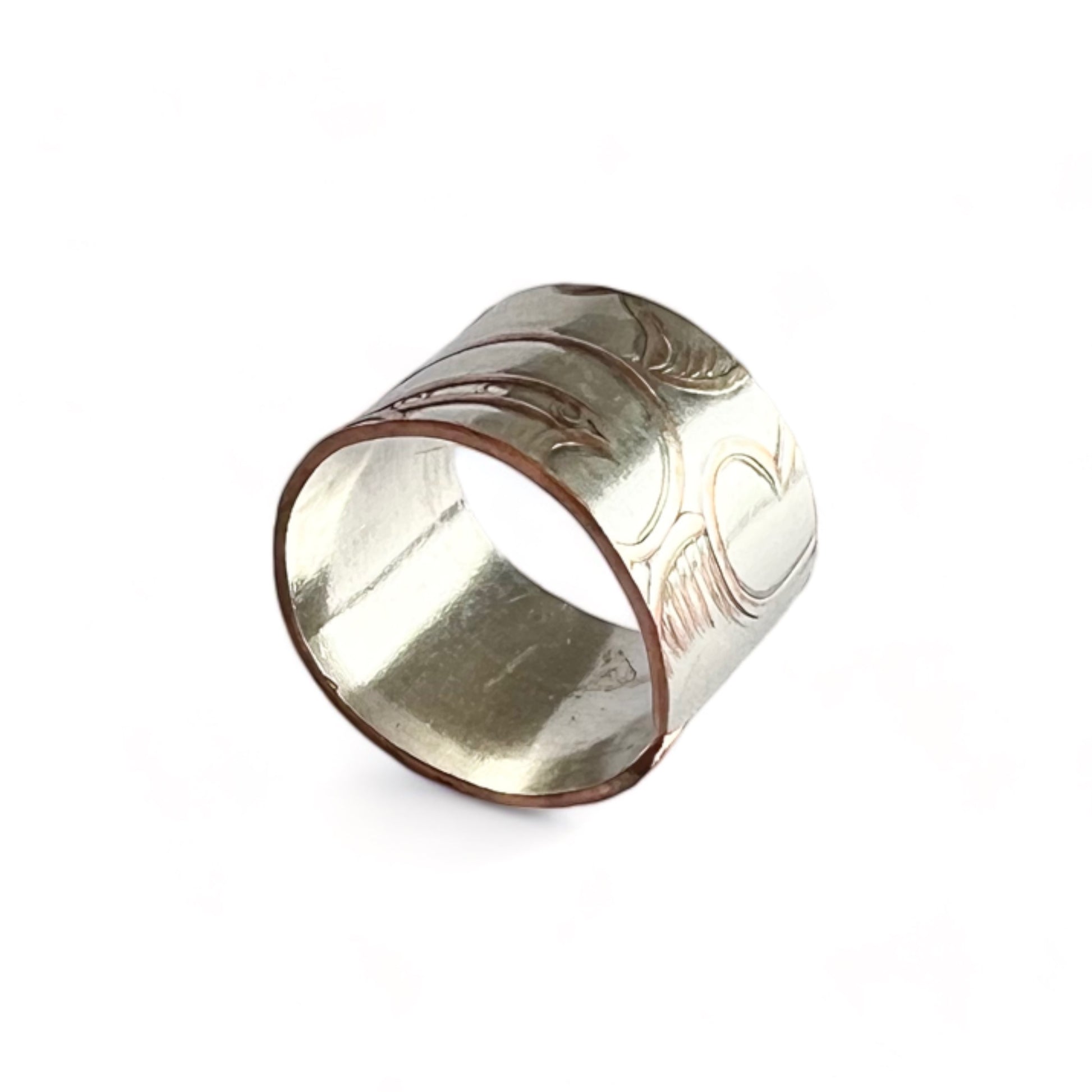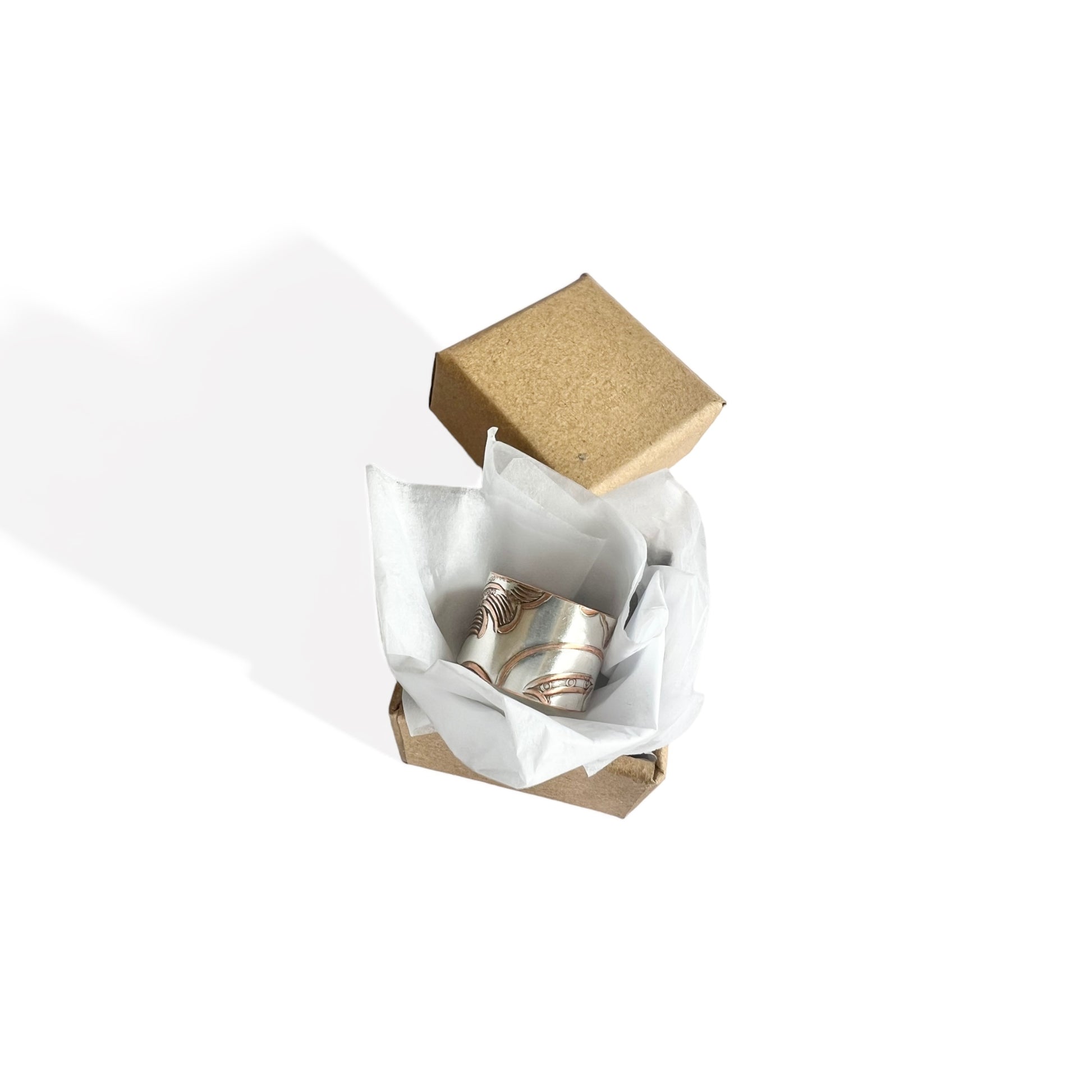 This lovely ring is made from an ornately decorated vintage silver serving platter, out of which I hand cut the ring, filed and sanded it down to a perfect finish and hammered it around a ring mandrel to make this one of a kind adjustable wrap ring.