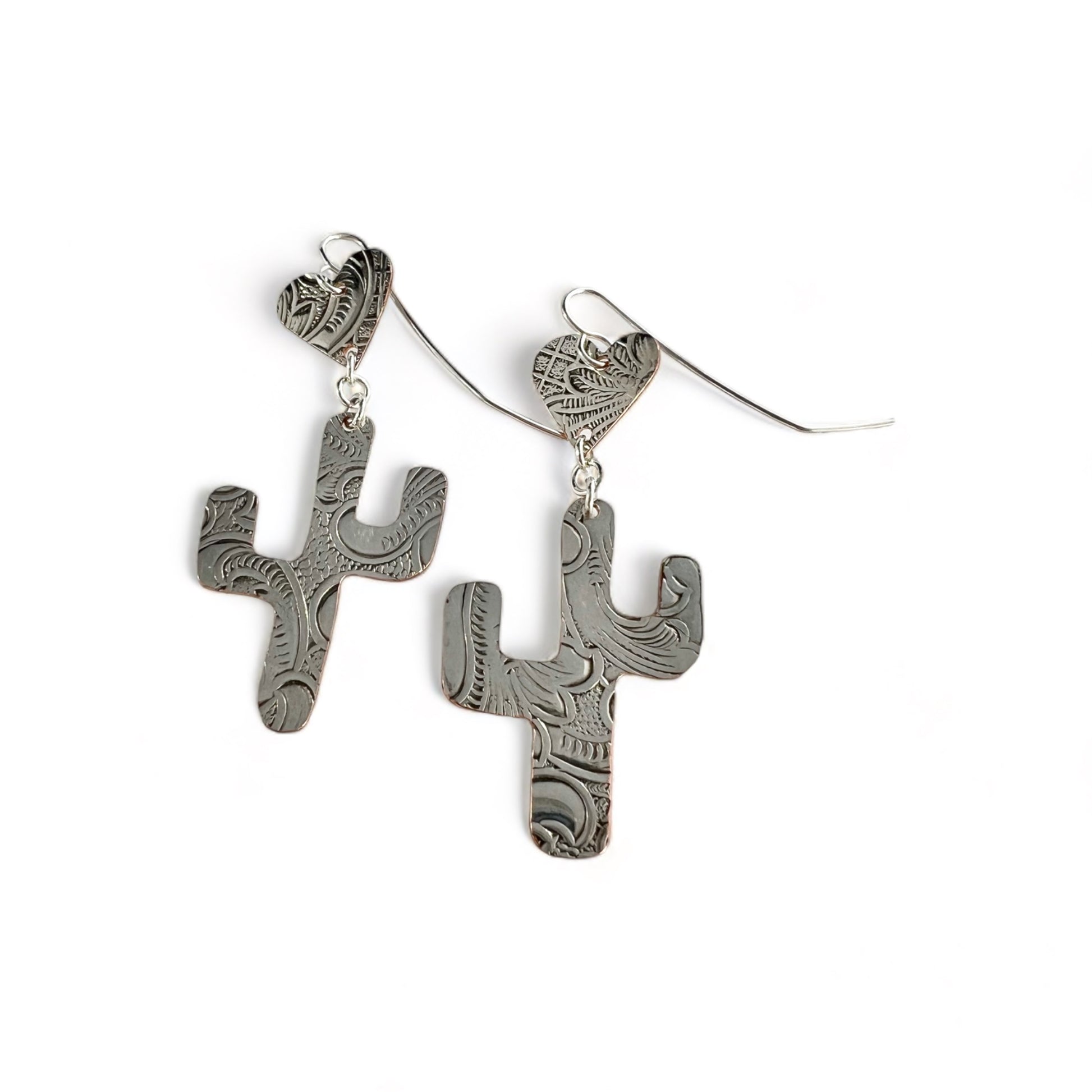 Above the cactus is a heart shaped charm made from the same silver dish and a sterling silver ear wire. They come with little plastic stoppers so your earrings will never fall out.