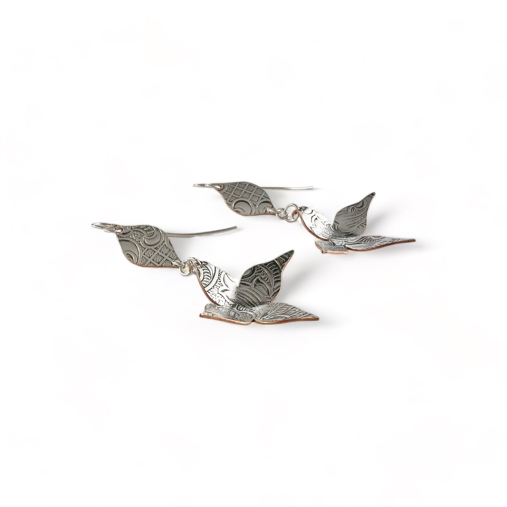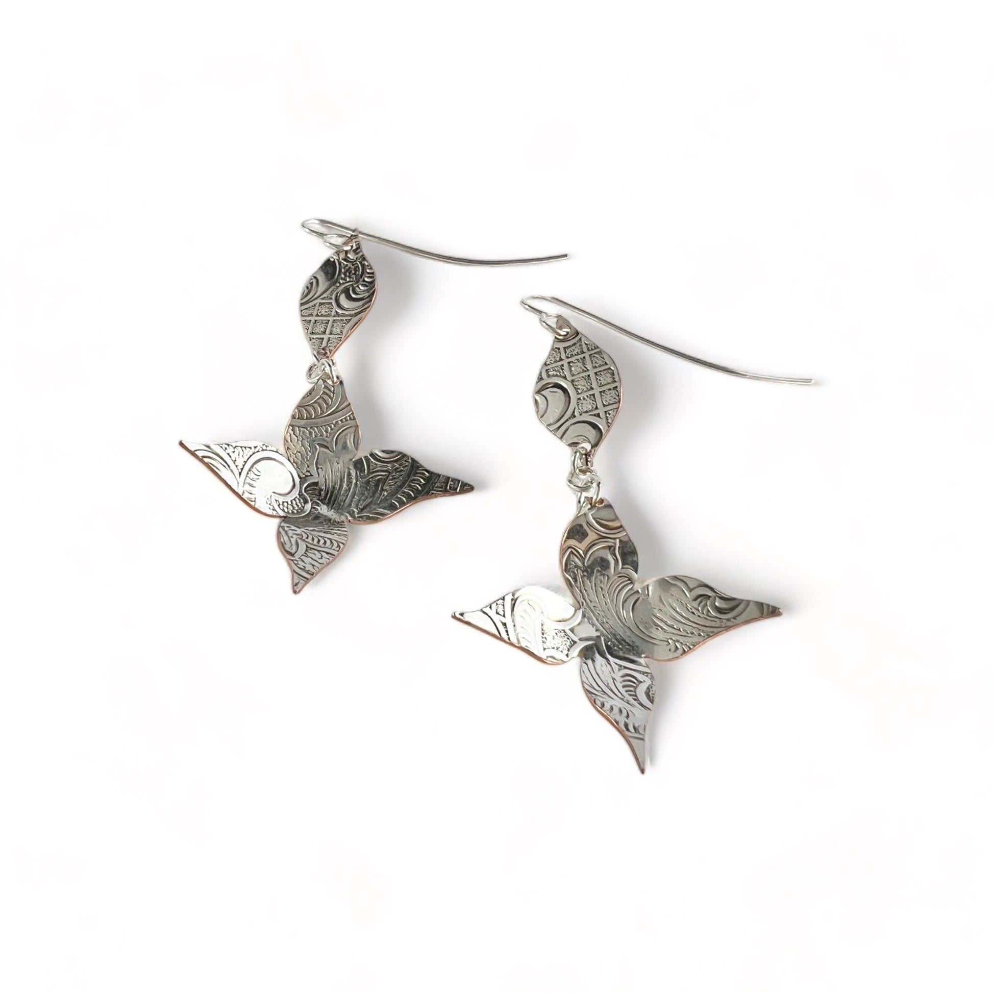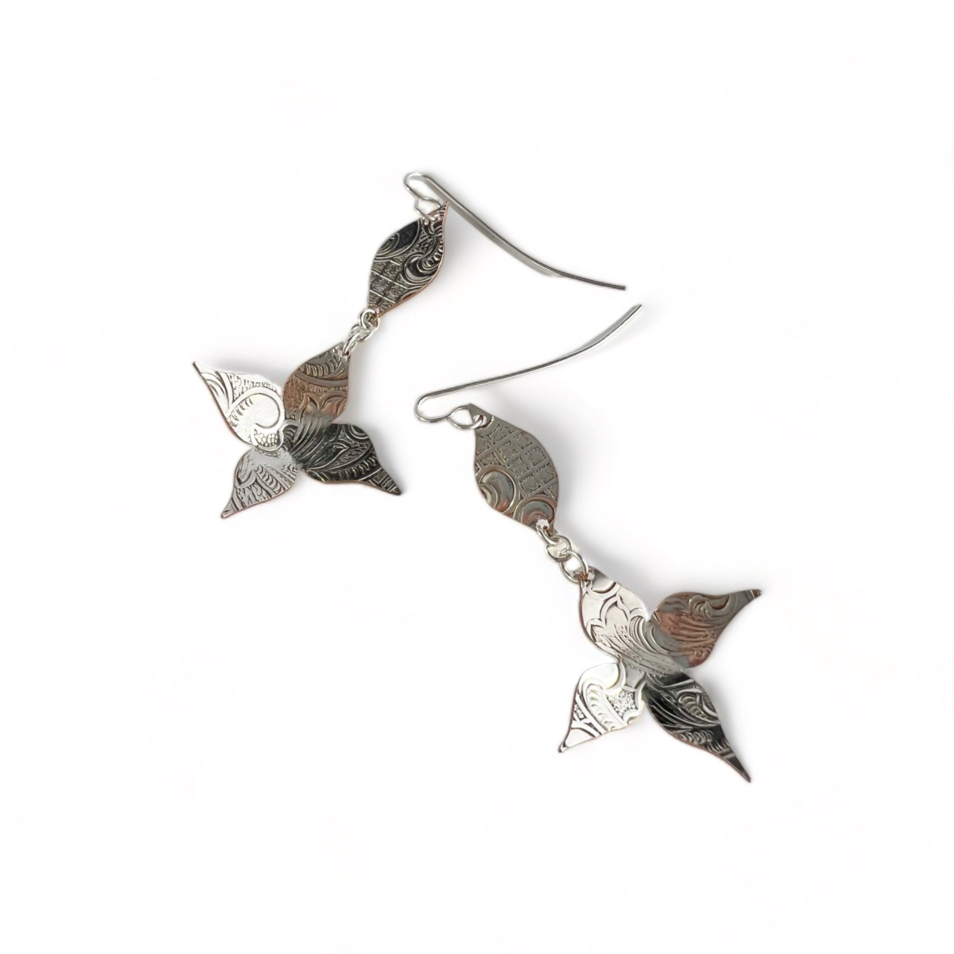These earrings are made from a vintage silver plated copper serving dish. I have hand cut the shape of a tropical flower out of the dish, filed and sanded it to a perfect finish and attached a sterling silver ear wire to the top. They have a subtle weight to them, while they are eye catching they are lightweight enough to wear all day.