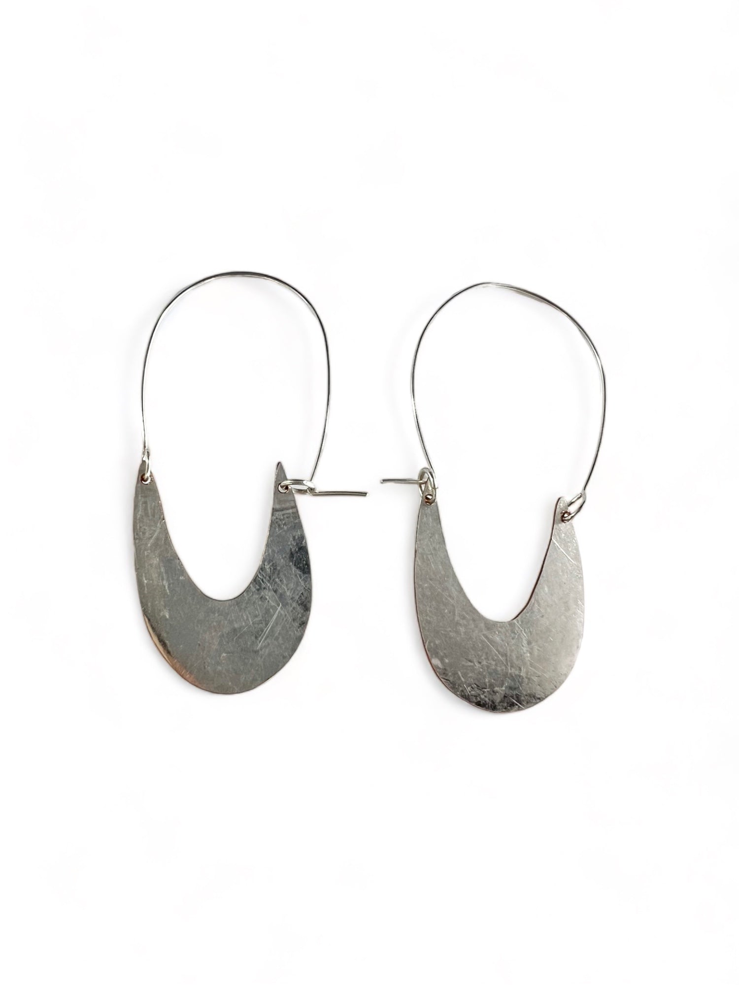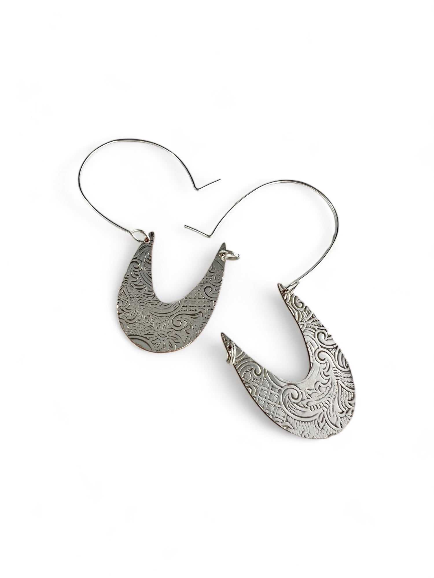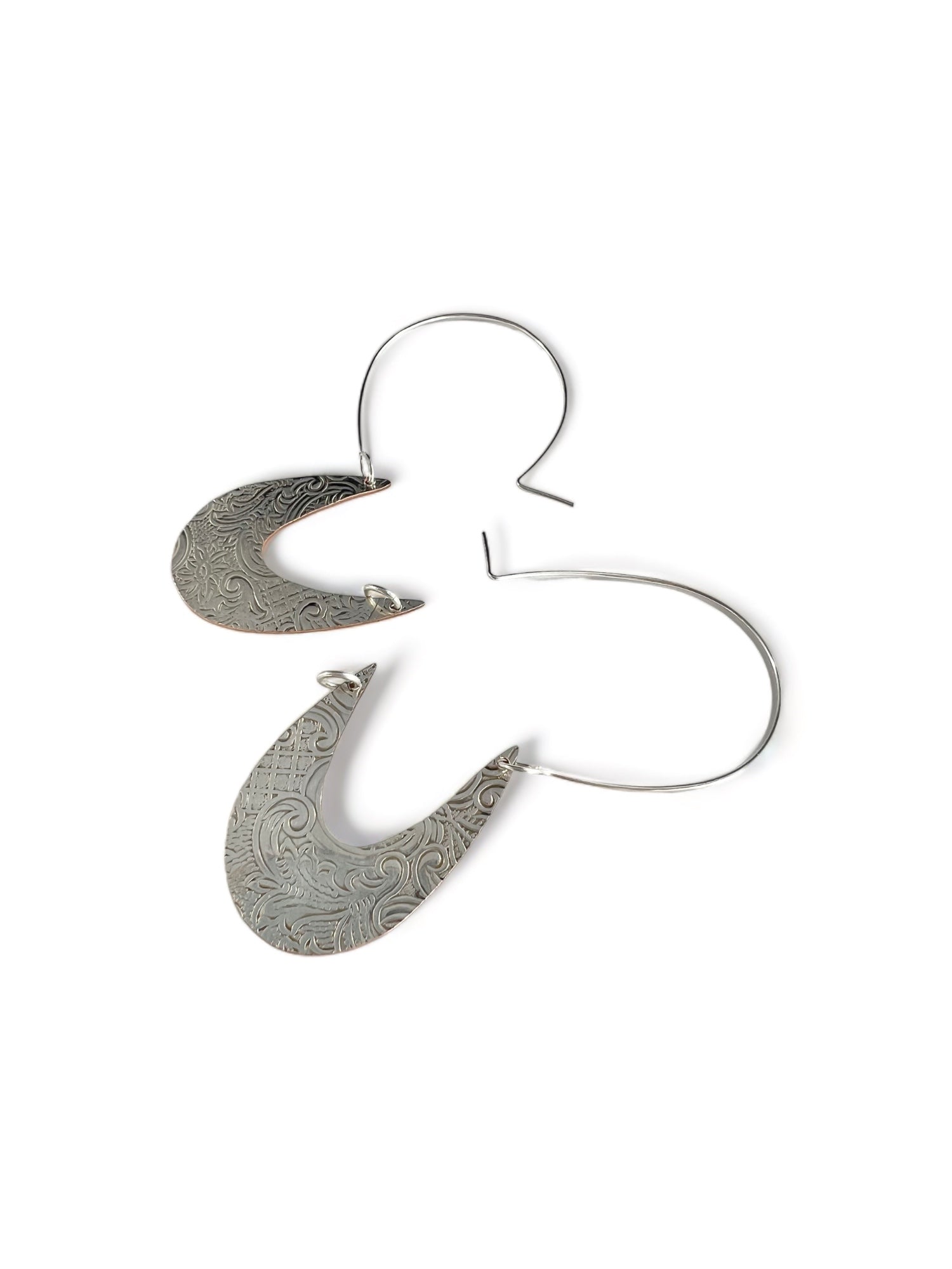 These earrings are made from a vintage silver dish which had a beautiful embossed in the centre of flowers, scrolls and leaves in an art nouveau style. I followed the line of the pattern into a half moon shape, drilled it and attached a sterling silver ear wire which is connected to either side of the charm. One side is hooked and unloops from the other side for you to insert the ear wire, and then clip it back up.