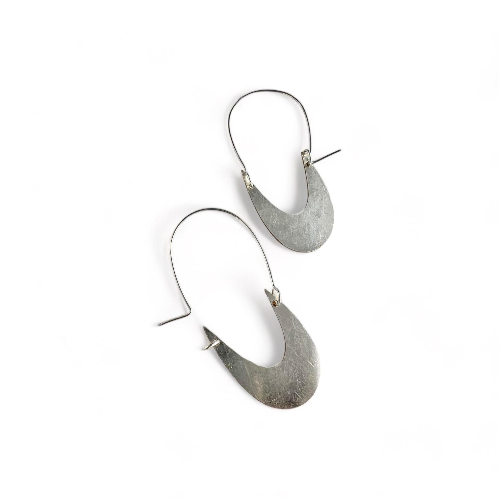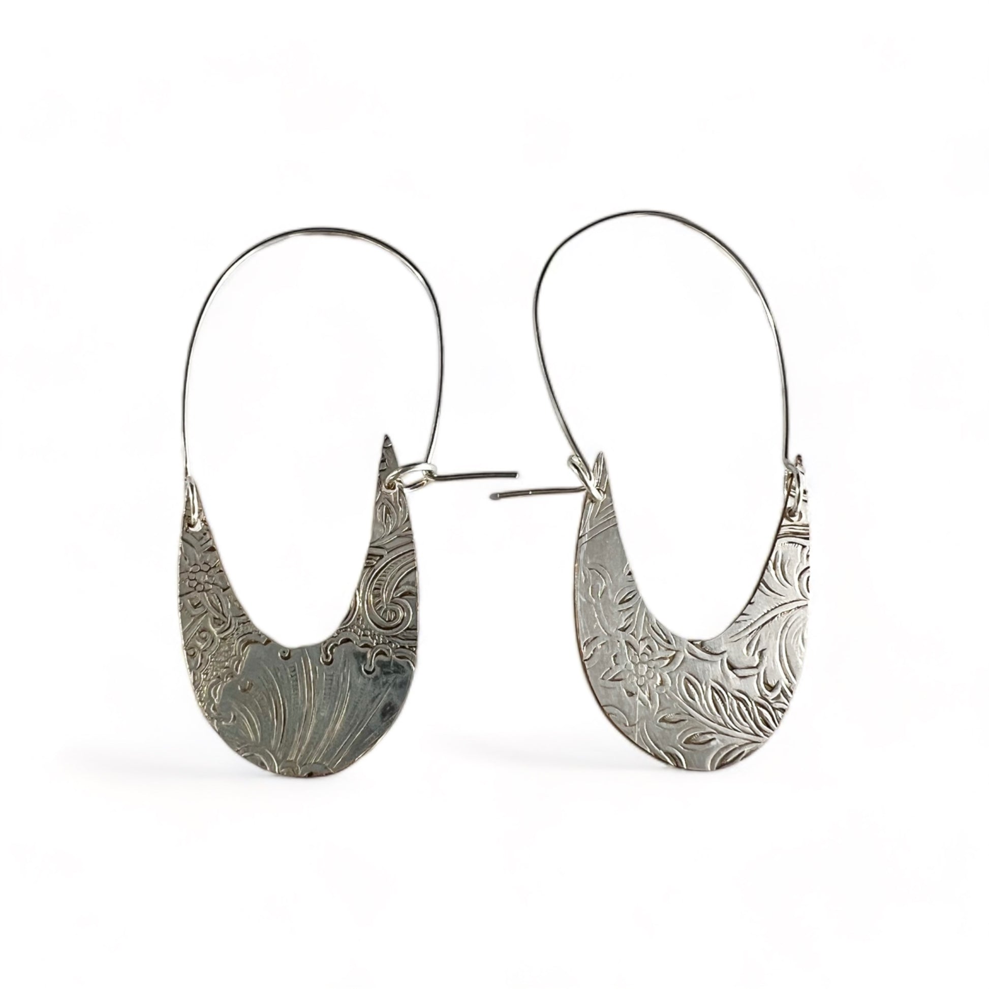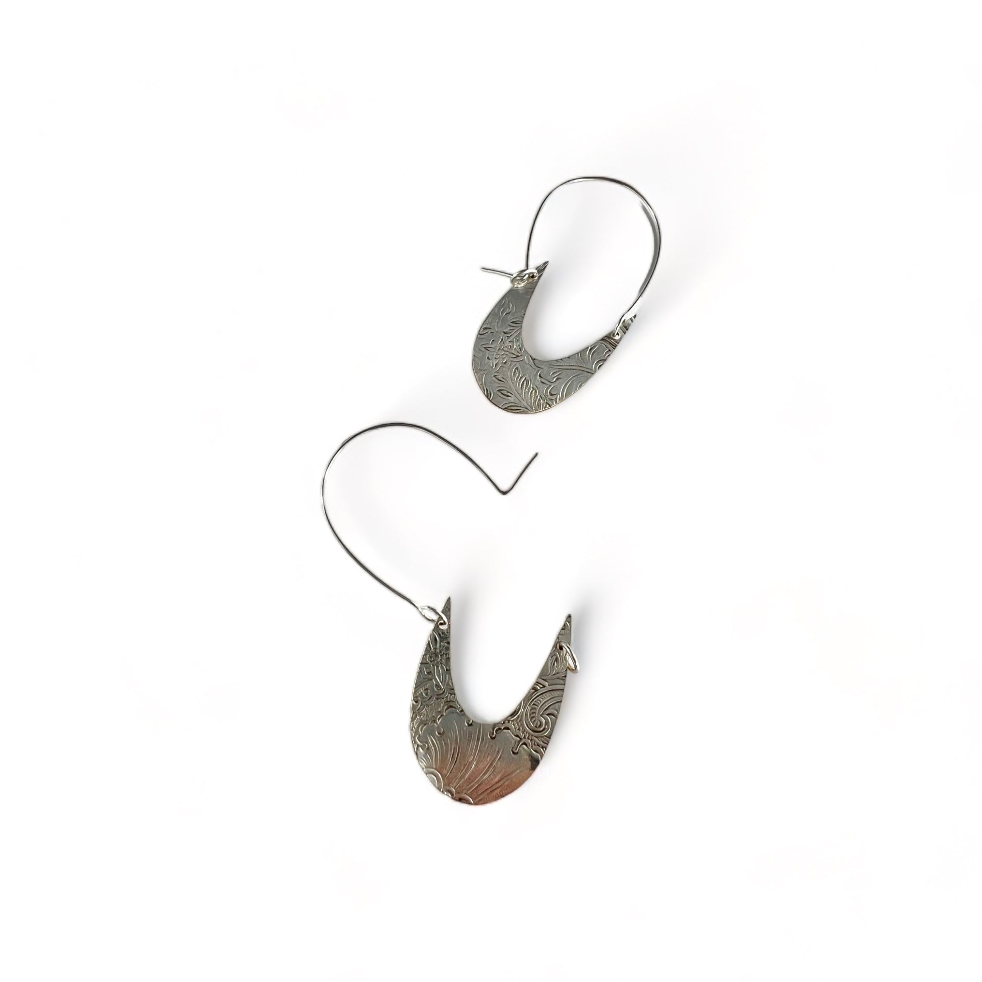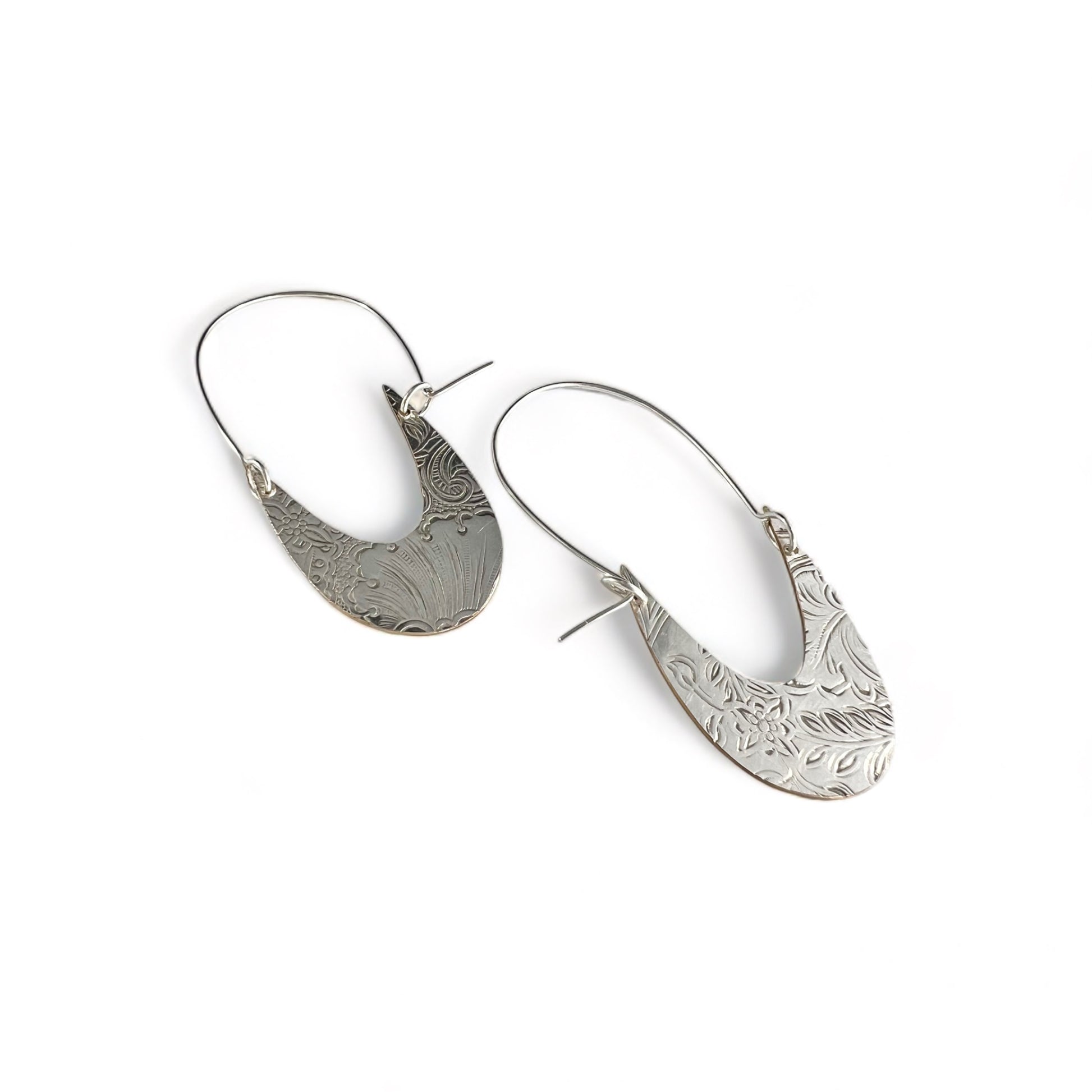 These earrings are made from a vintage silver dish which had a beautiful embossed around the edge of flowers and leaves in an art nouveau style. I followed the line of the pattern into a half moon shape, drilled it and attached a sterling silver ear wire which is connected to either side of the charm. One side is hooked and unloops from the other side for you to insert the ear wire, and then clip it back up.