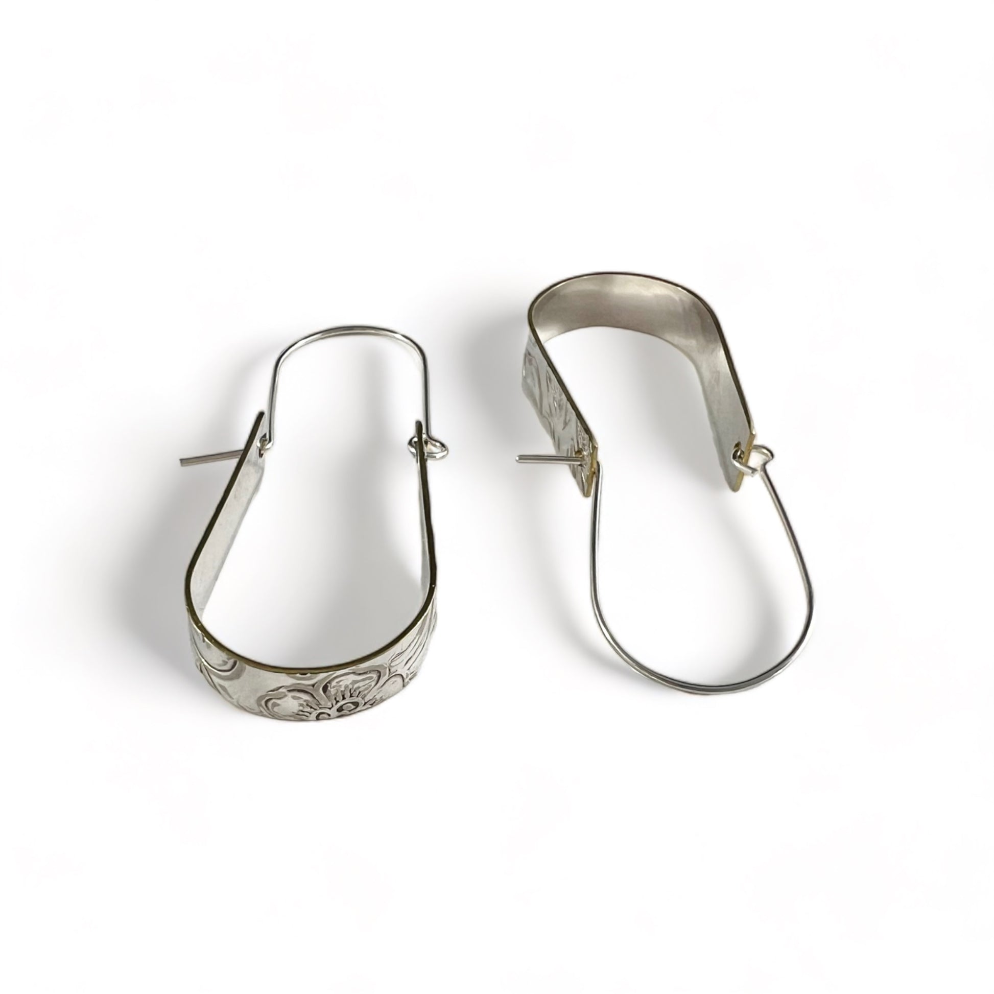 These earrings are made from a vintage silver plated brass dish which had a beautiful embossed design of flowers and leaves in art nouveau designs decorating it.