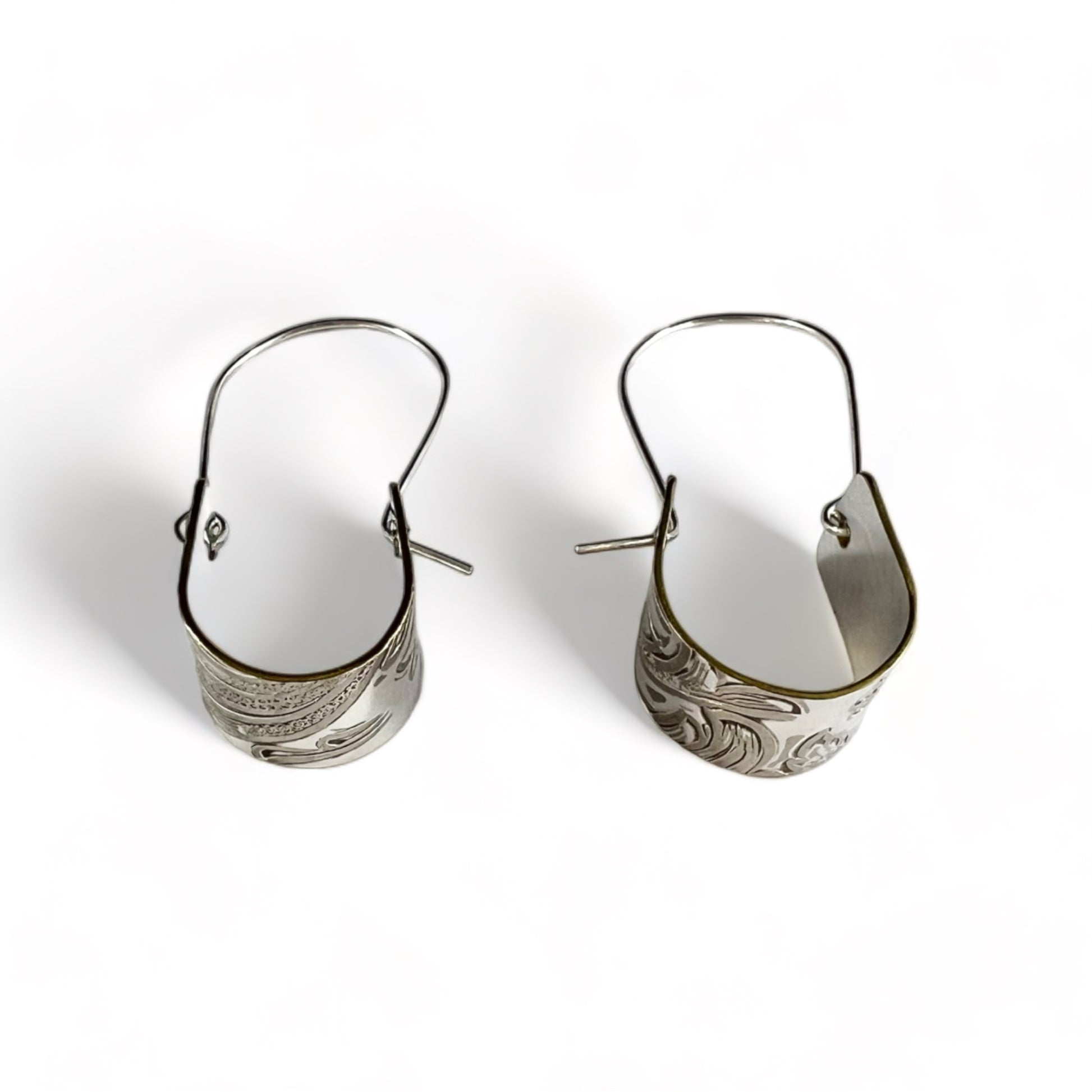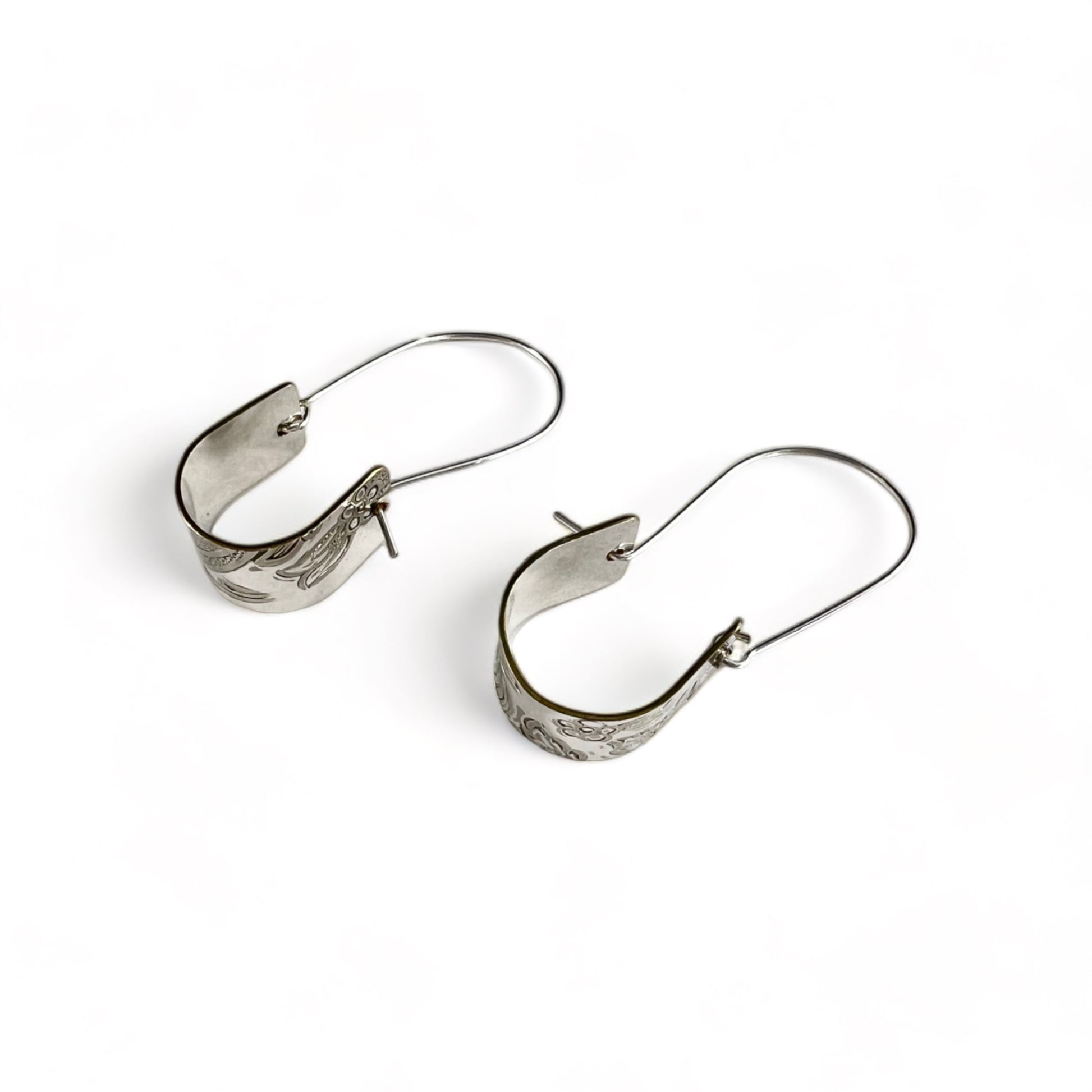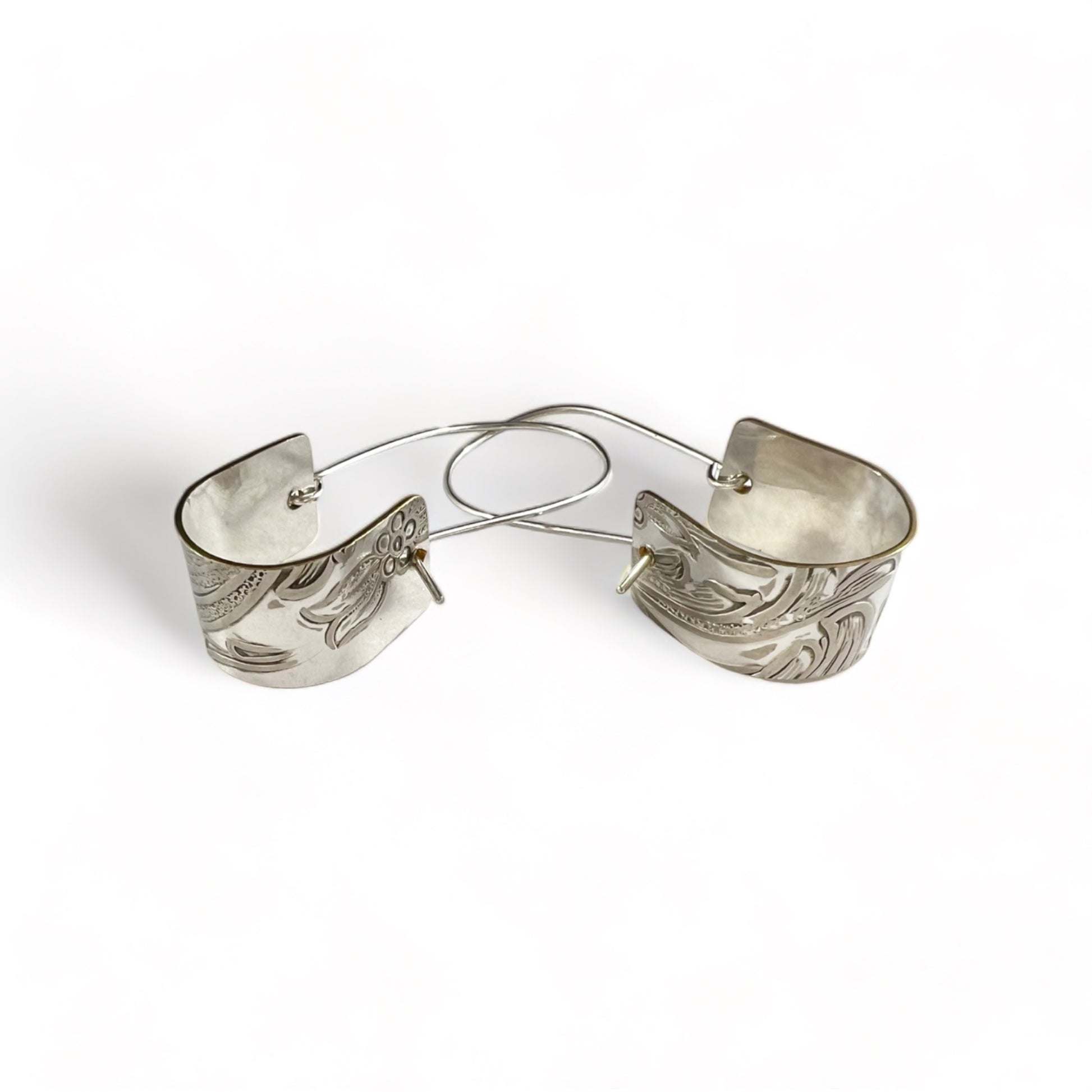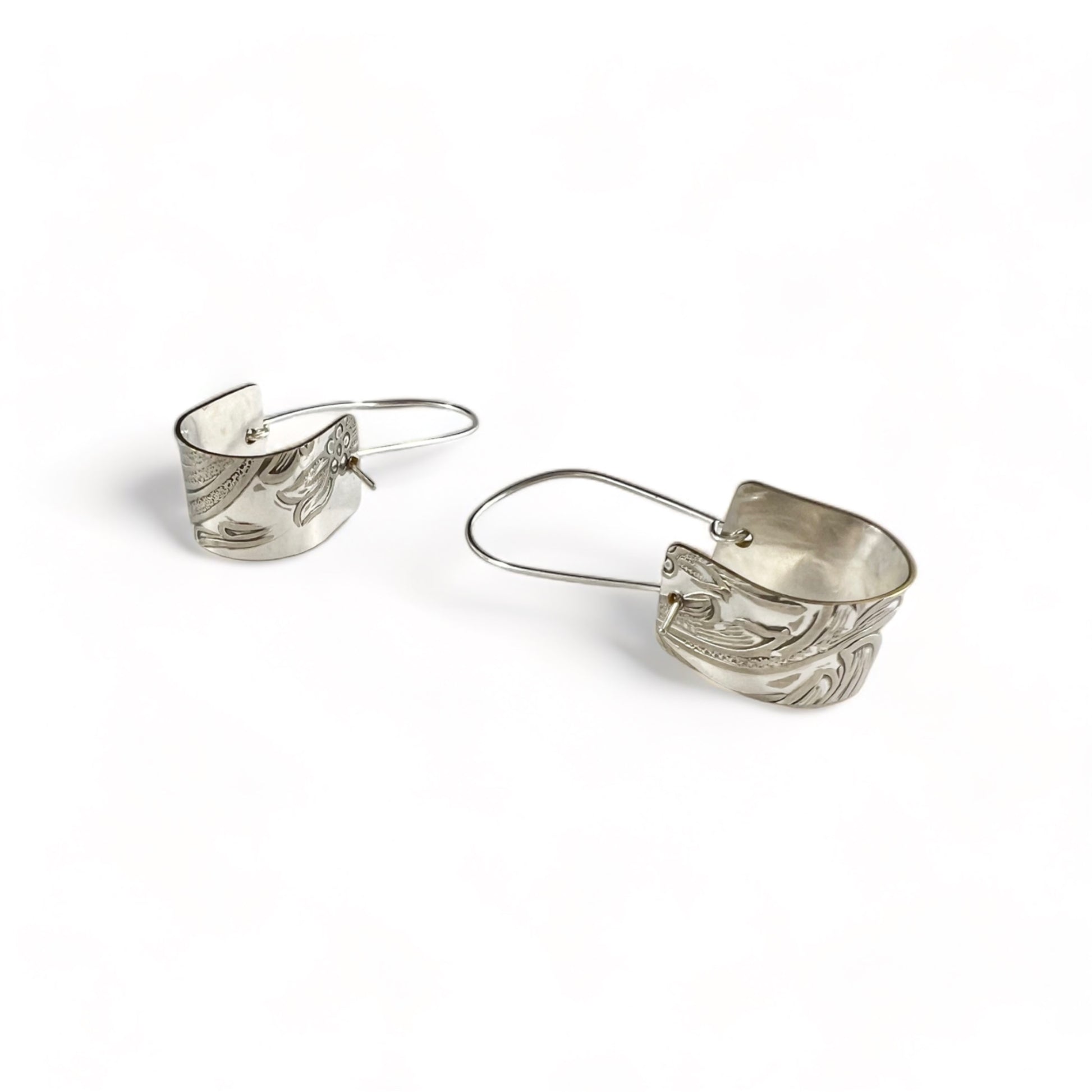 These earrings are made from a vintage silver plated brass dish which had a beautiful engraved design of flowers and leaves in art nouveau designs decorating it.