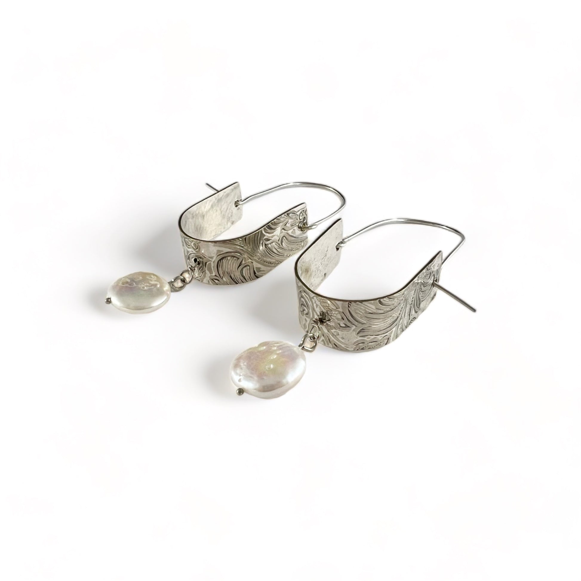 These earrings are made from a vintage silver plated brass dish which had a beautiful embossed design of flowers and leaves in art nouveau designs decorating it.