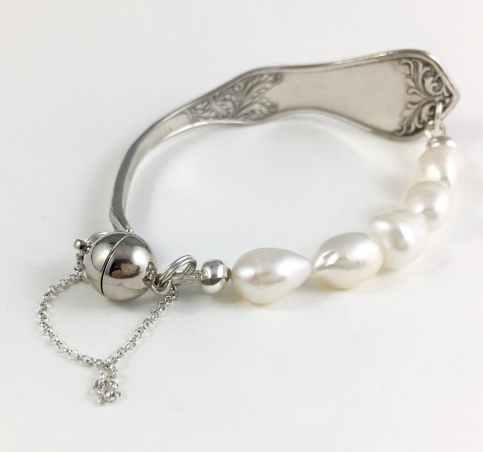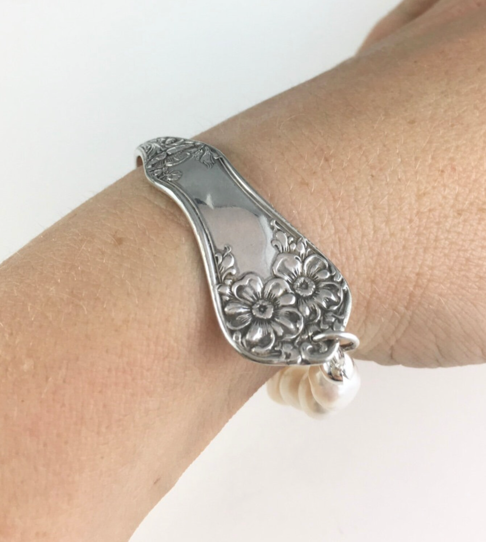 It will definitely be a talking point when you are wearing it; it has a lovely floral design on the handle. The pearls are hung on high quality, very strong, nylon and are organic oval shapes around 11 mm in length. The spoon segment bends gently around your wrist, so it sits flush with your skin and the sterling silver clasp is very easy to do up on your own.