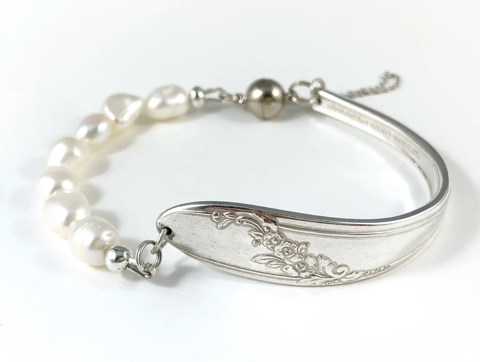It will definitely be a talking point when you are wearing it; it has a lovely floral design on the handle. The pearls are hung on high quality, very strong, nylon and are organic oval shapes around 11 mm in length. The spoon segment bends gently around your wrist, so it sits flush with your skin and the magnetic clasp is very easy to do up on your own - the sterling silver safety chain is there so if you catch it on your bag, it will just snap shut again without falling off.