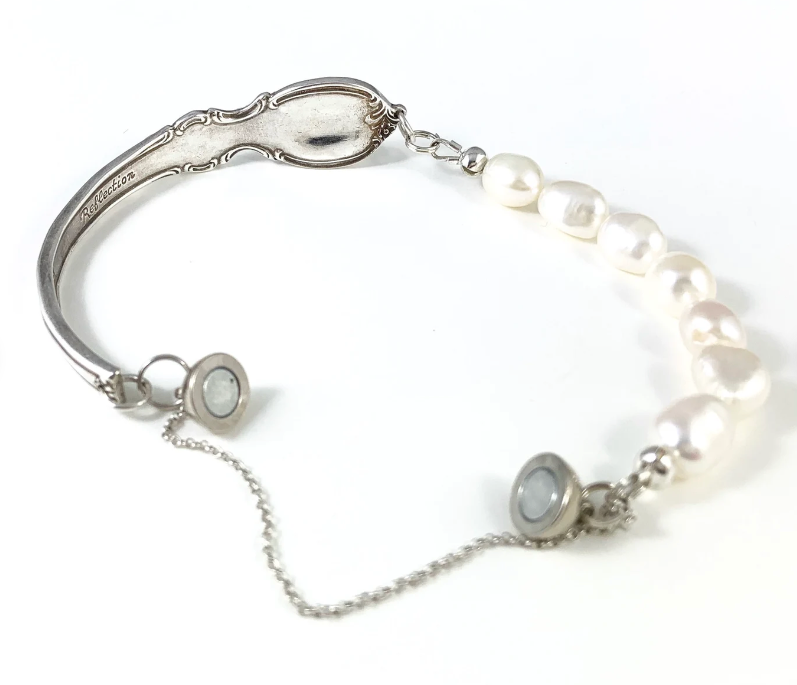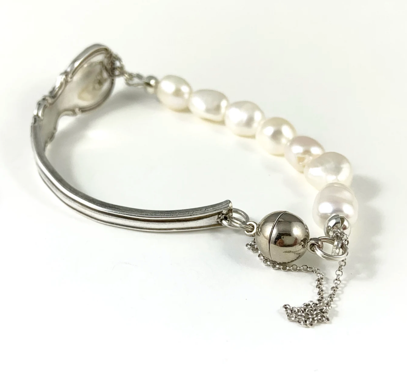 It will definitely be a talking point when you are wearing it; it has a lovely daffodil design on the handle. The pearls are hung on high quality, very strong, nylon and are organic oval shapes around 11 mm in length. The spoon segment bends gently around your wrist, so it sits flush with your skin and the magnetic clasp is very easy to do up on your own - the sterling silver safety chain is there so if you catch it on your bag, it will just snap shut again without falling off.