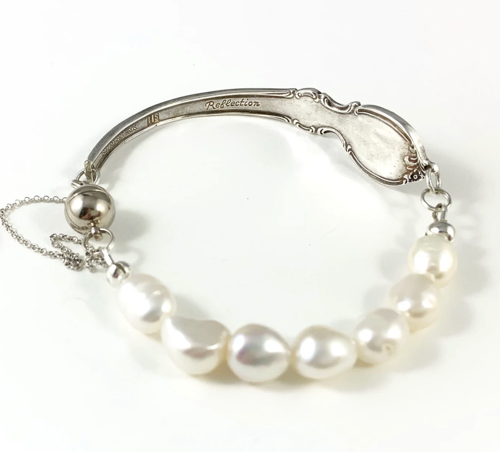 This bracelet is made from a silver plated teaspoon, which I have re-worked into a wearable piece of art. it is fun and classic and a little piece of history.