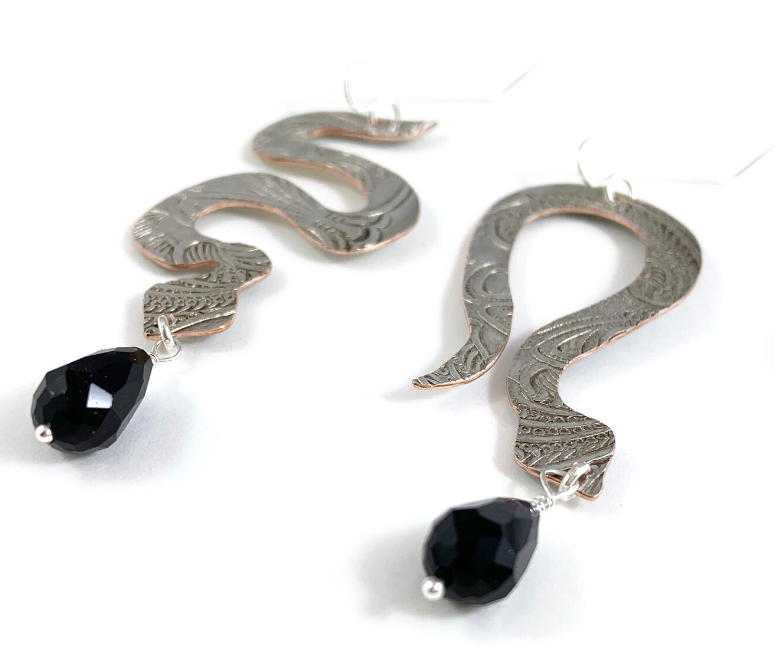 These earrings are made from a vintage silver dish which had a beautiful pattern embossed on it. Using various jewellery making techniques I hand cut the shape of a twisted snake and another of a bended snake out of the dish, filed and sanded it to a perfect finish before hanging a faceted black glass bead off the end of its head. They hang off a sterling silver earring hook and all connecting parts are sterling silver.