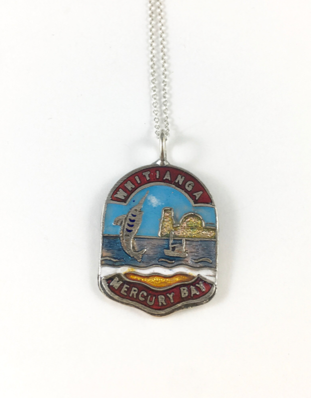 This necklace is made from the end of a vintage sterling silver and enamel souvenir teaspoon from Whitianga, New Zealand. It shows a marlin jumping out of the water, and the silver setting has a very interesting shape to it.